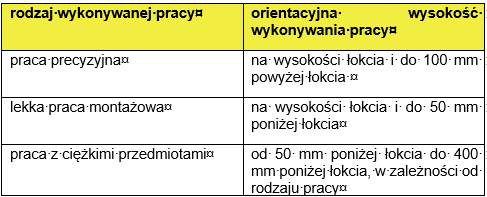 - Różne rodzaje zadań wykonywanych przy danym stole roboczym mogą wymagać zajęcia różnych pozycji, siedzącej albo stojącej, a pracownik powinien mieć możliwość dostosowania wysokości do aktualnie wykonywanego zadania.