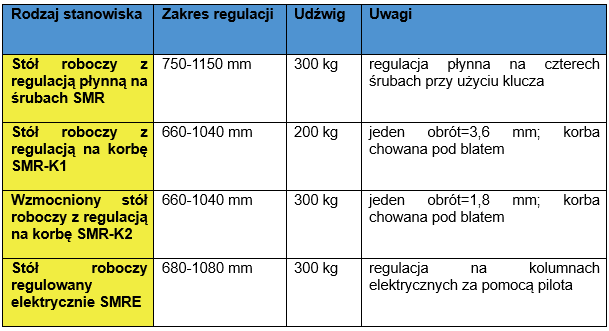 Stoły robocze mogą być wyposażone w różne rodzaje regulacji wysokości, przy czym każdy typ regulacji ma swoje unikalne zalety i w różnym stopniu wpływa na cenę stanowiska roboczego. Stoły robocze można wyposażyć w mechaniczną płynną regulację wysokości na śrubach, w regulację na korbę oraz w elektryczną regulację na kolumnach.