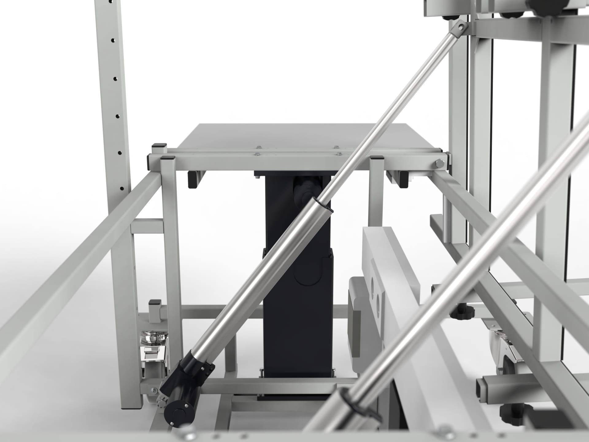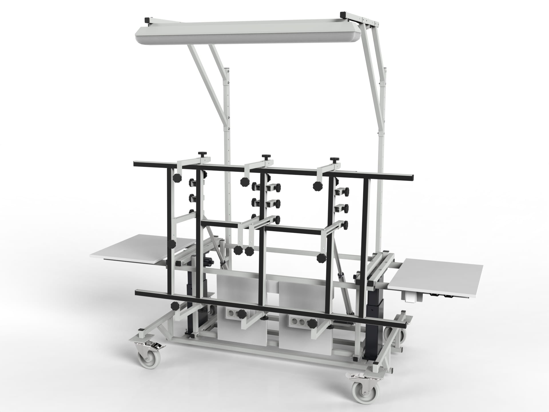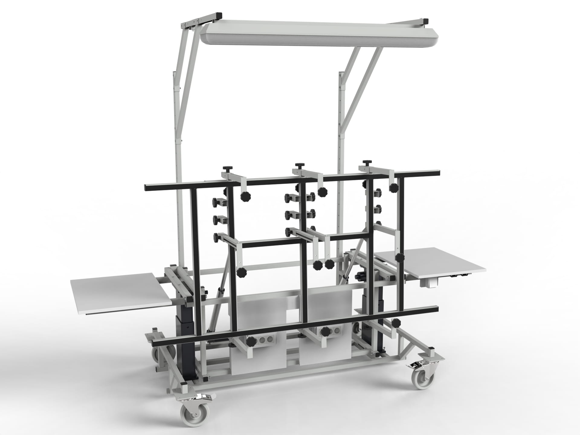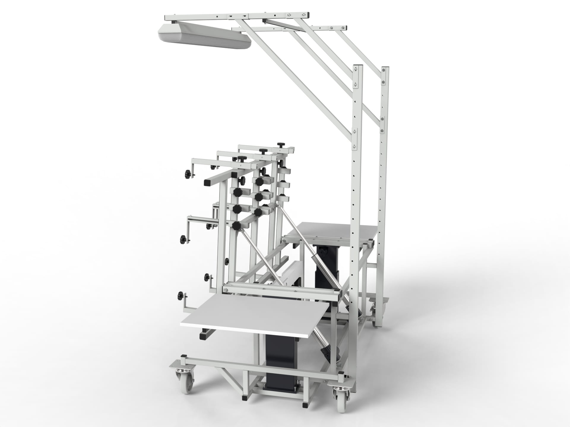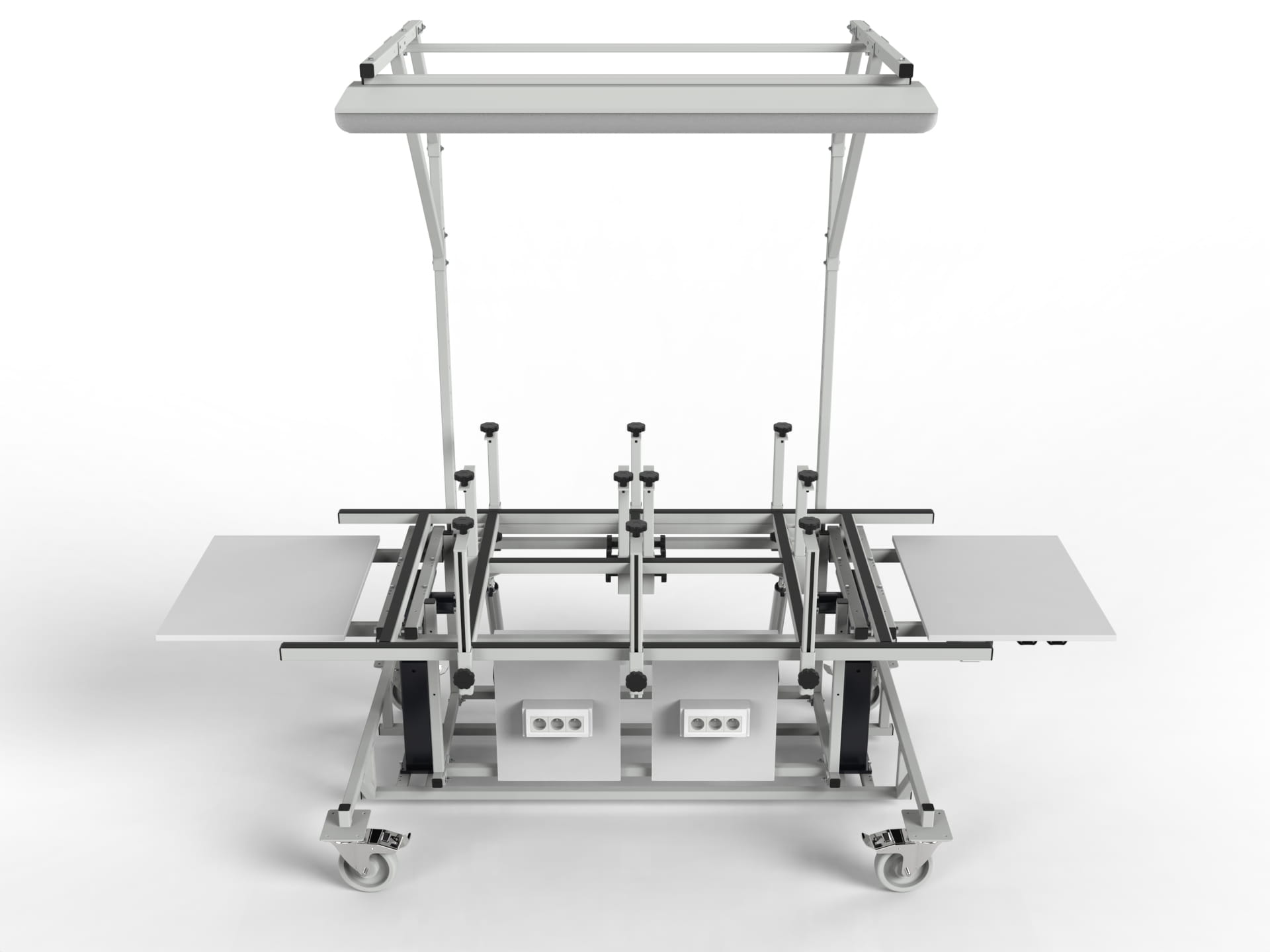 - Stół jest mobilny dzięki 4 aluminiowym kołom łożyskowanym, obrotowym i hamowanym