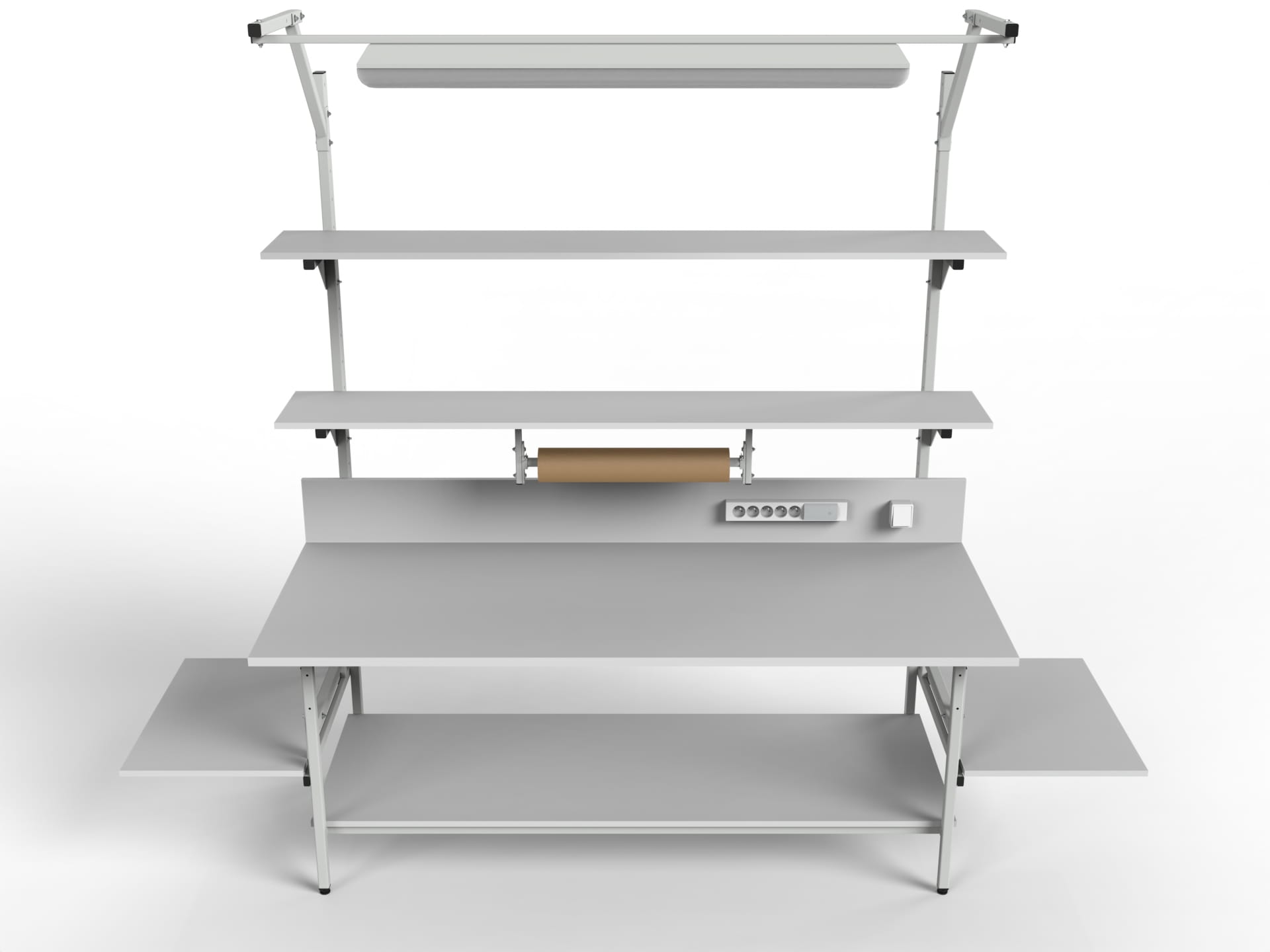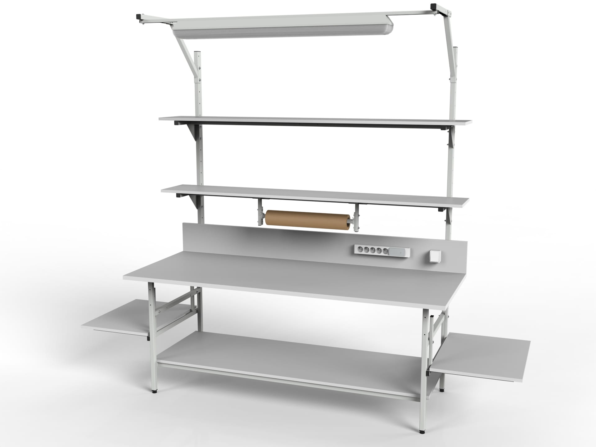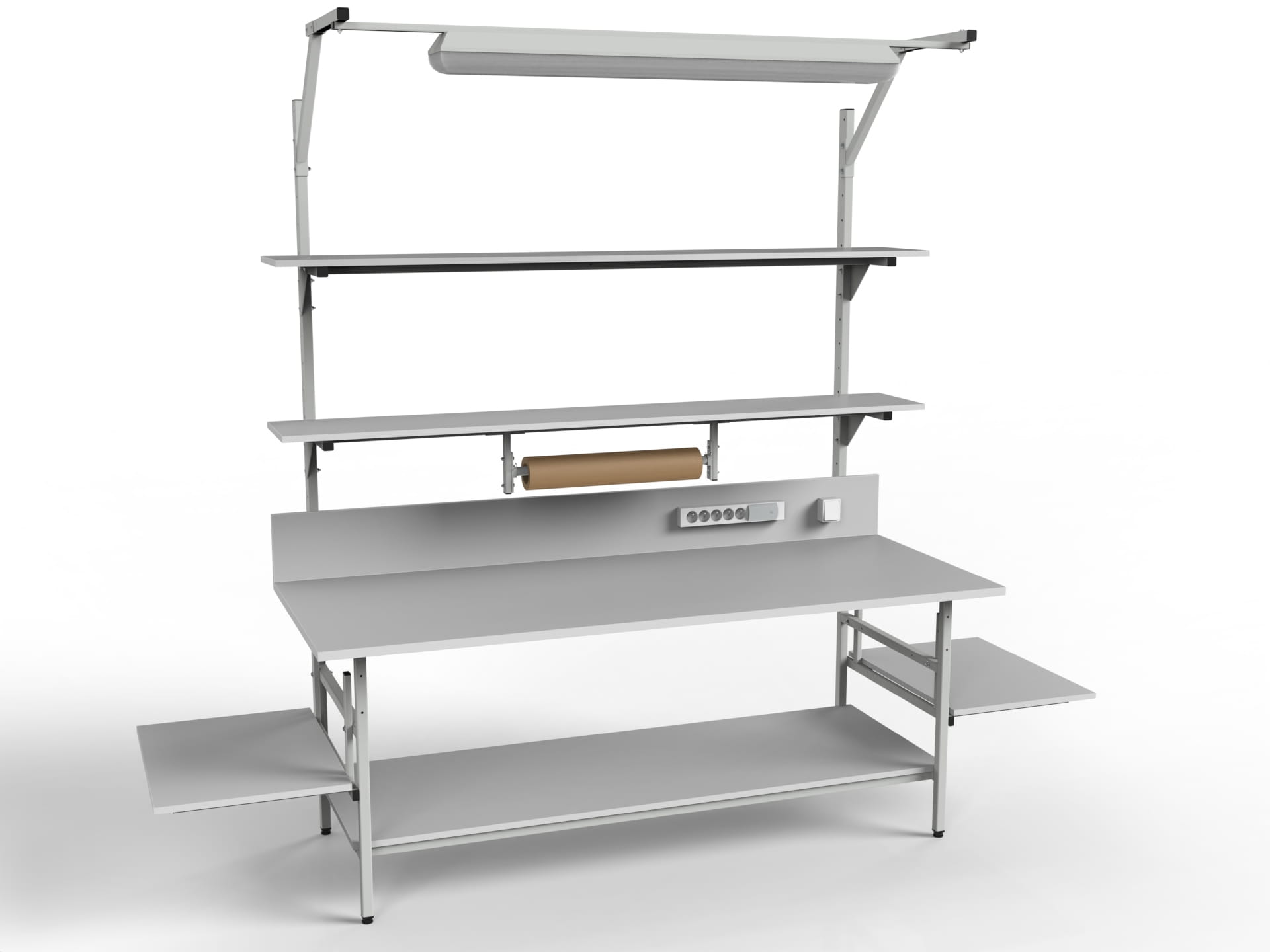 Ergonomiczne stanowisko do pakowania wyposażone w szeroki wachlarz dodatków. Konstrukcja oparta jest na solidnych profilach stalowych, które pomalowano farbą proszkową by zwiększyć odporność na ścieranie i korozję. Duża ilość półek - dwie górne, dwie boczne oraz większa dolna - umożliwia łatwe składowanie narzędzi, części zamiennych, końcówek, szpul materiałowych, pudełek, pojemników czy ustawienie komputera i drukarki. Rolka umieszczona pod półką usprawnia proces pakowania a opcjonalna listwa zasilająca zapewnia możliwość podpięcia elektronarzędzi i innych urządzeń. Całość komplementuje oświetlenie centralne umieszczone w przemysłowej, pyłoszczelnej oprawie. Stół z serii SP sprawdzi się doskonale zarówno jako stanowisko do konfekcjonowania jak i stół roboczy lub montażowy w każdym warsztacie, hali magazynowej czy w zakładzie produkcyjnym.