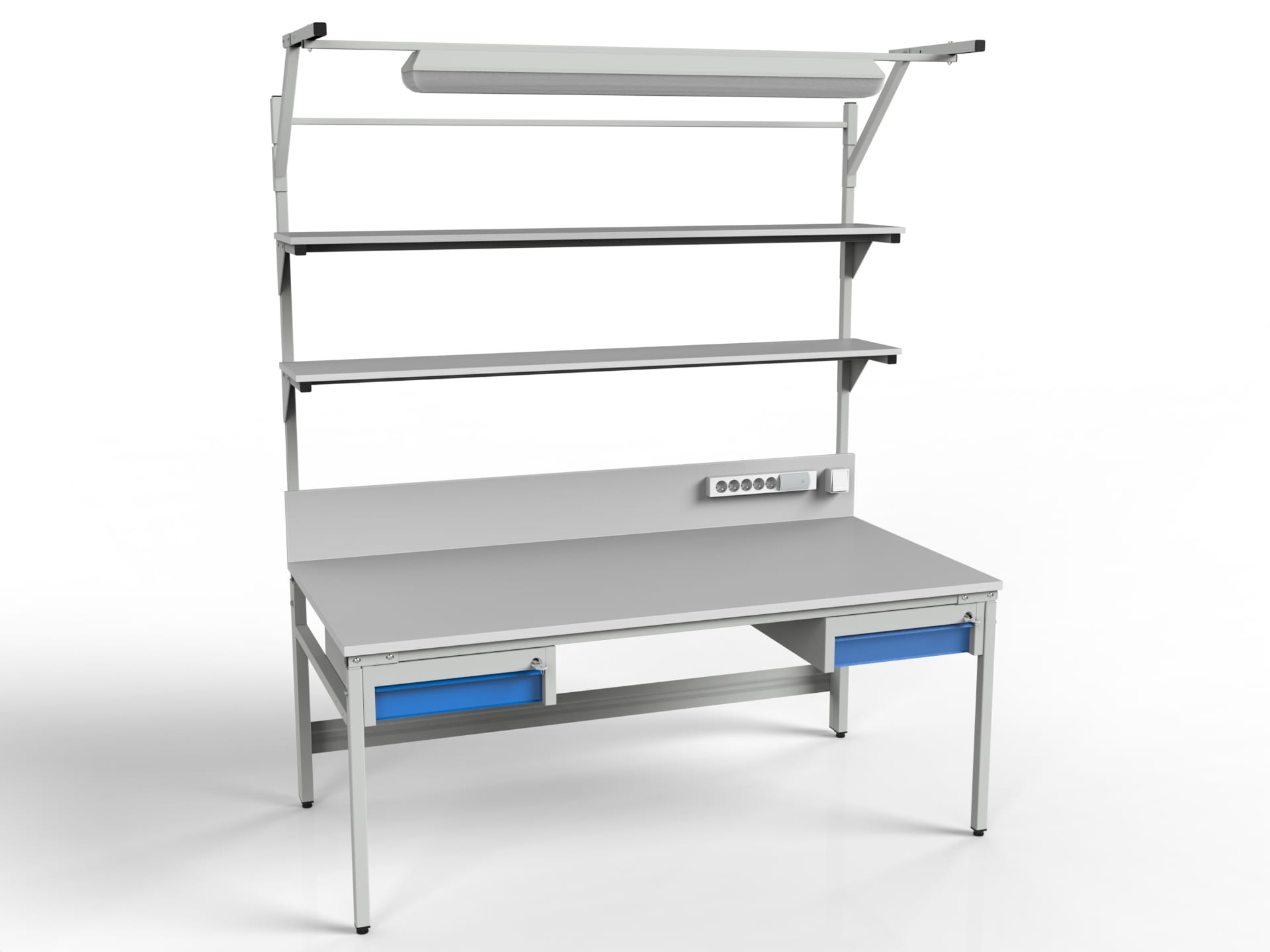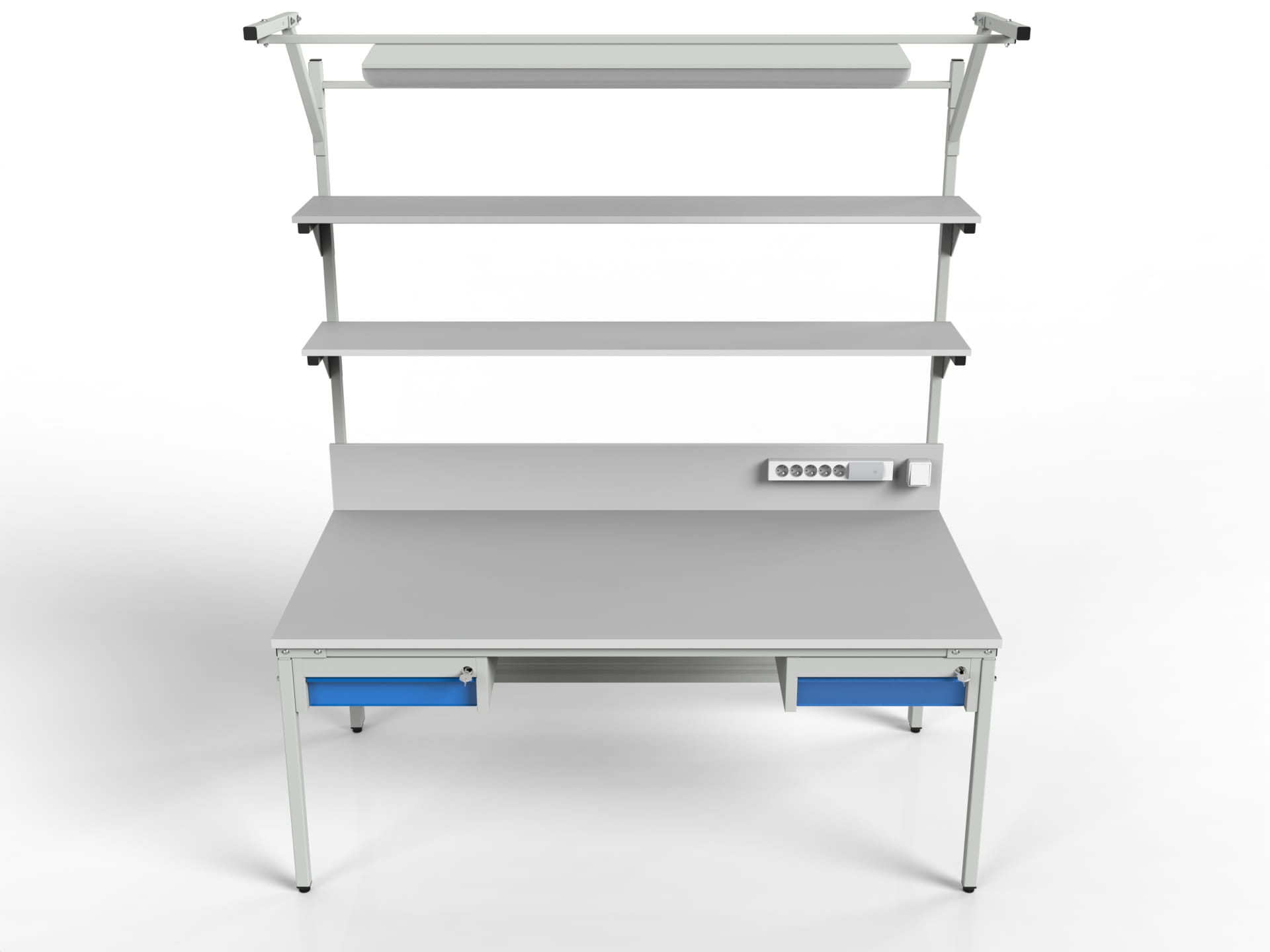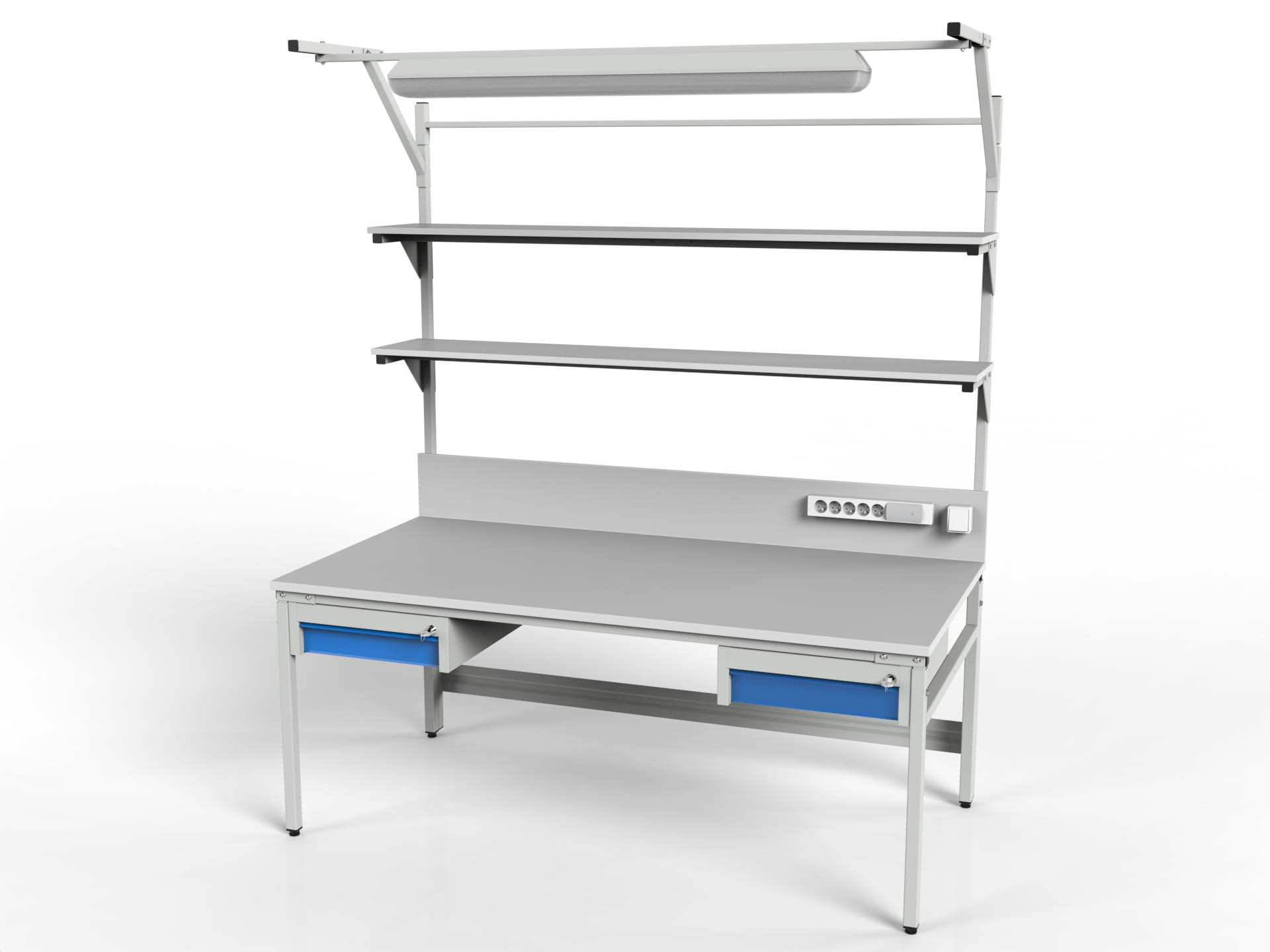 Stół montażowy SMRPK6C z dwiema półkami, szufladami i oświetleniem LED