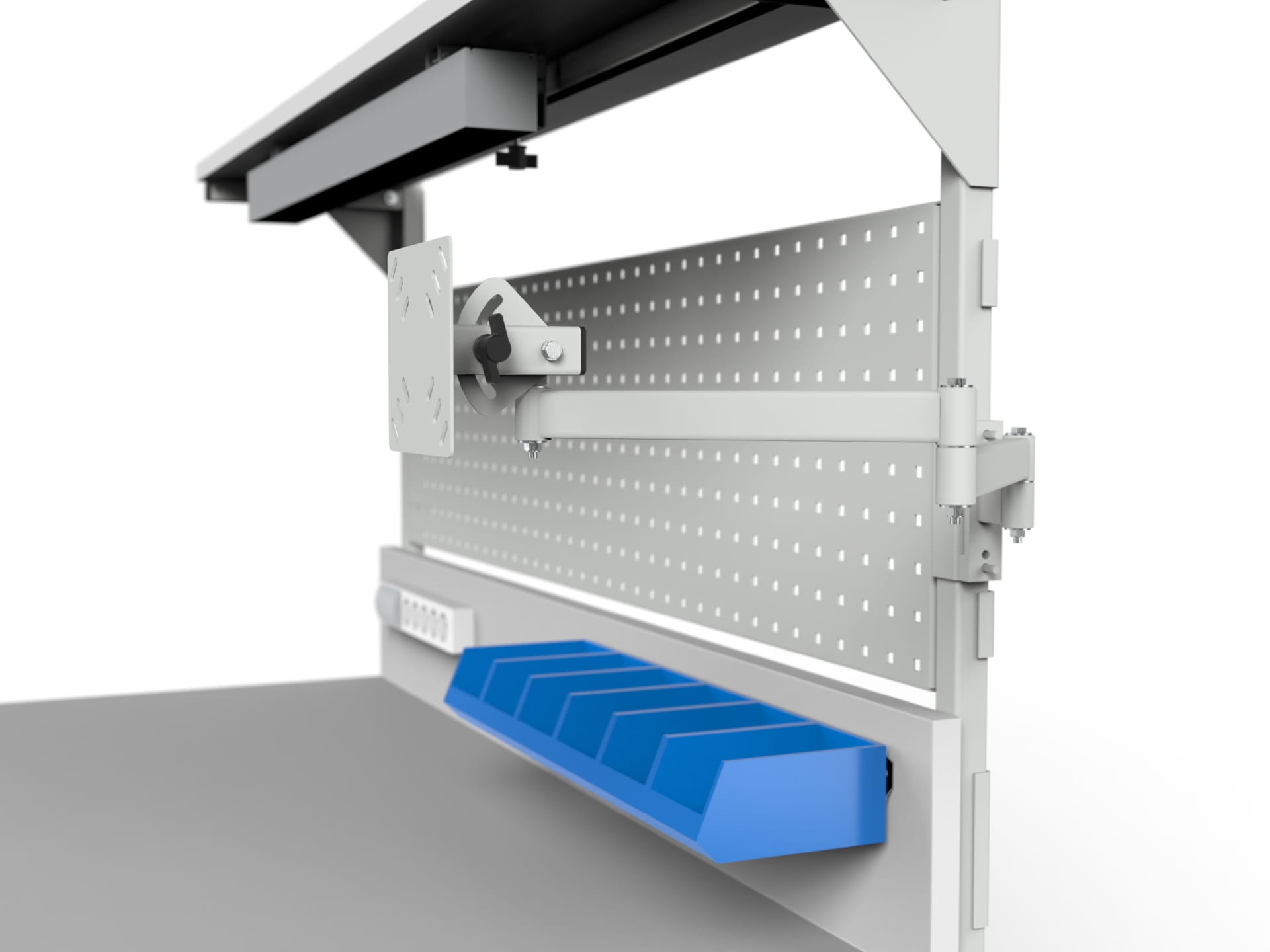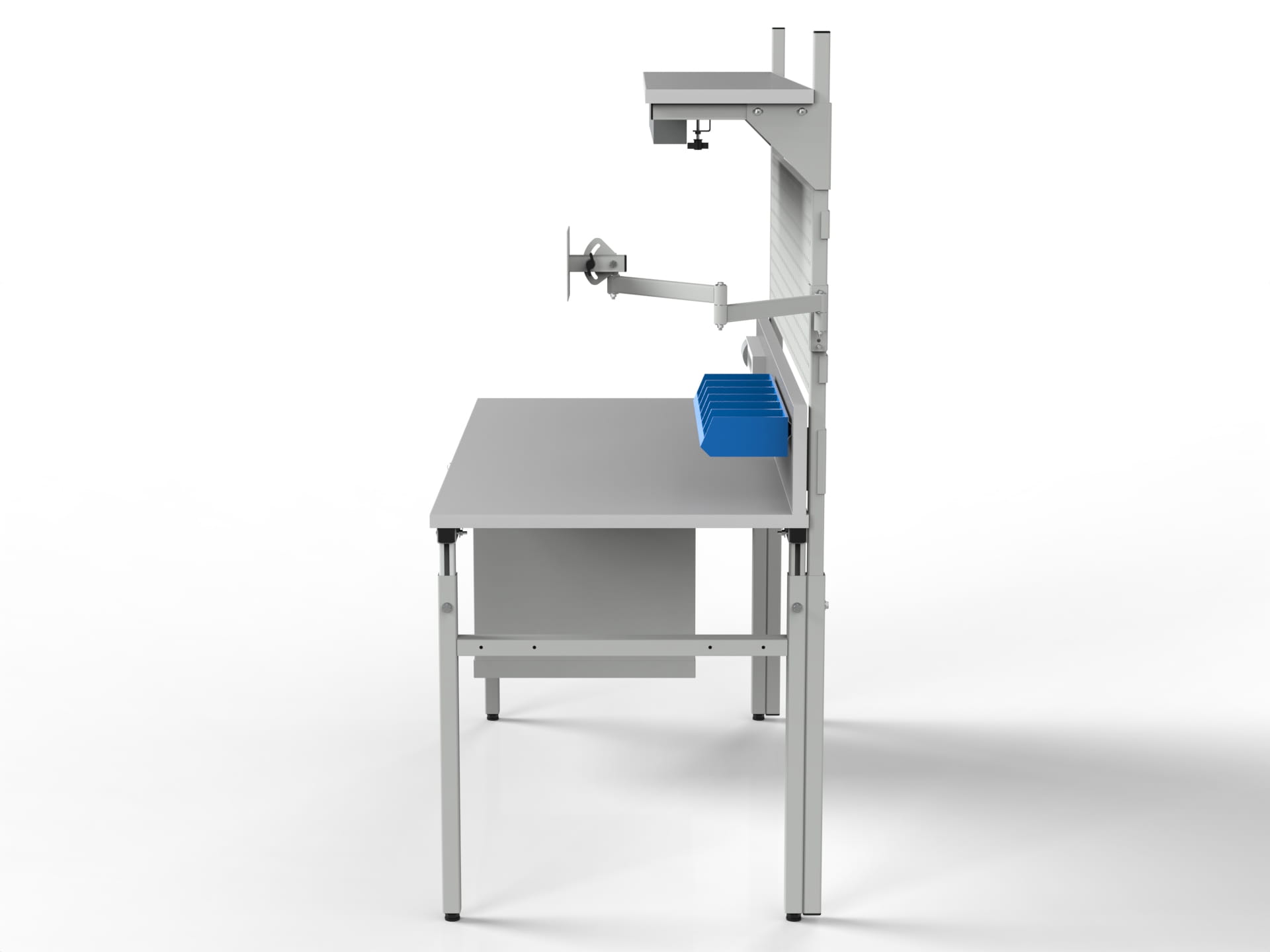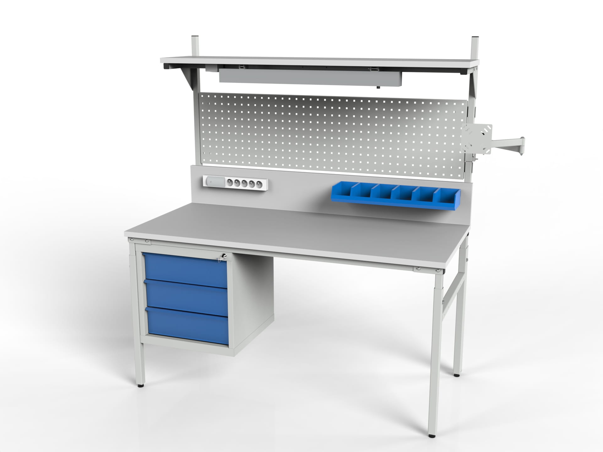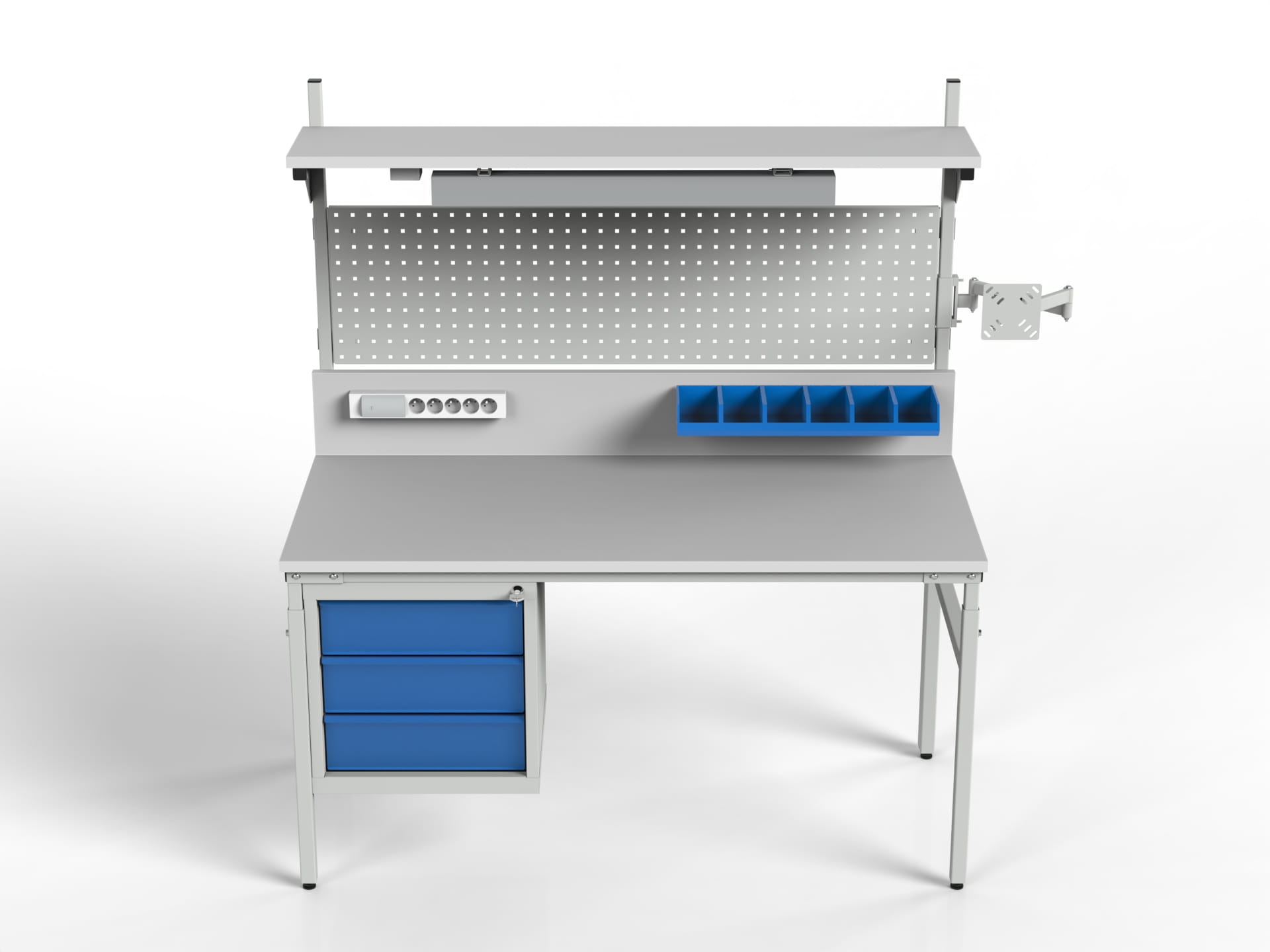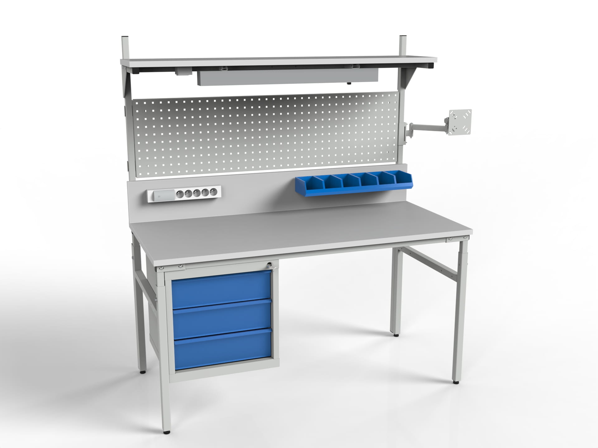 Stanowisko robocze SMRPK1 z szafką narzędziową, półką z oświetleniem, ścianką tylną i perforowaną i ramieniem z uchwytem monitora