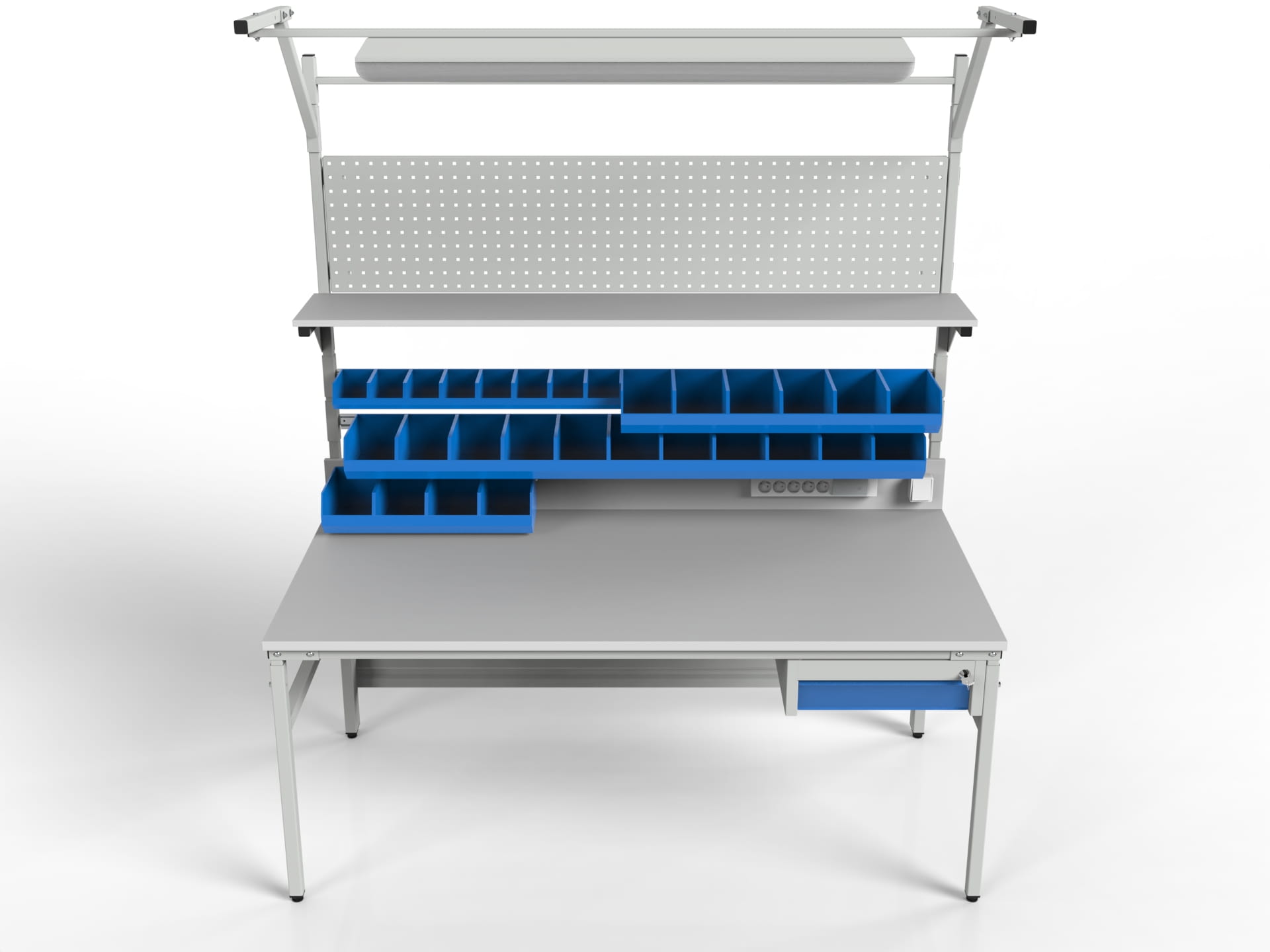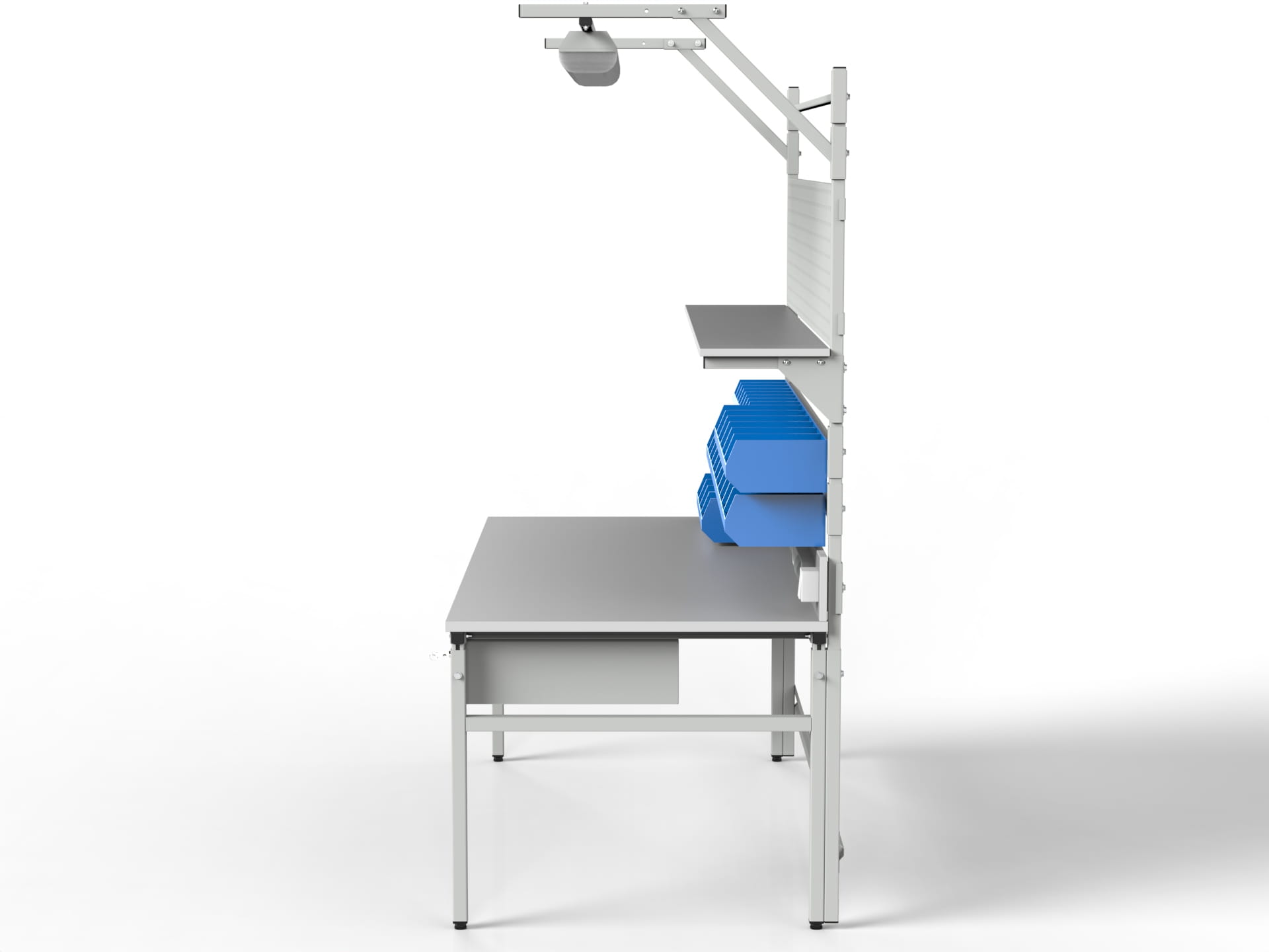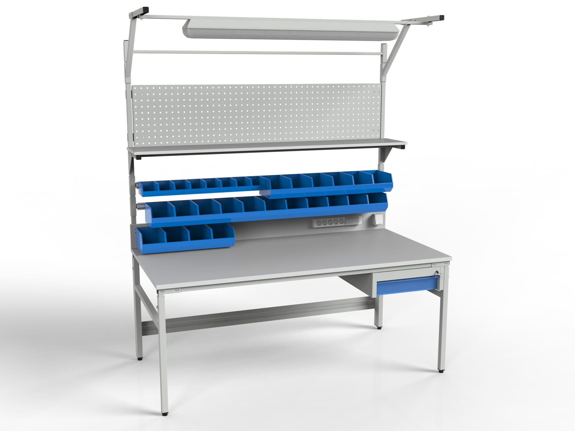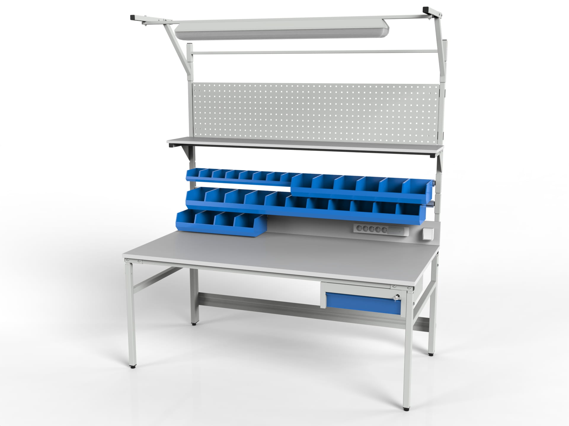 Stół roboczy z regulacją wysokości, centralnym oświetleniem, półką, ścianką perforowaną i pojemnikami