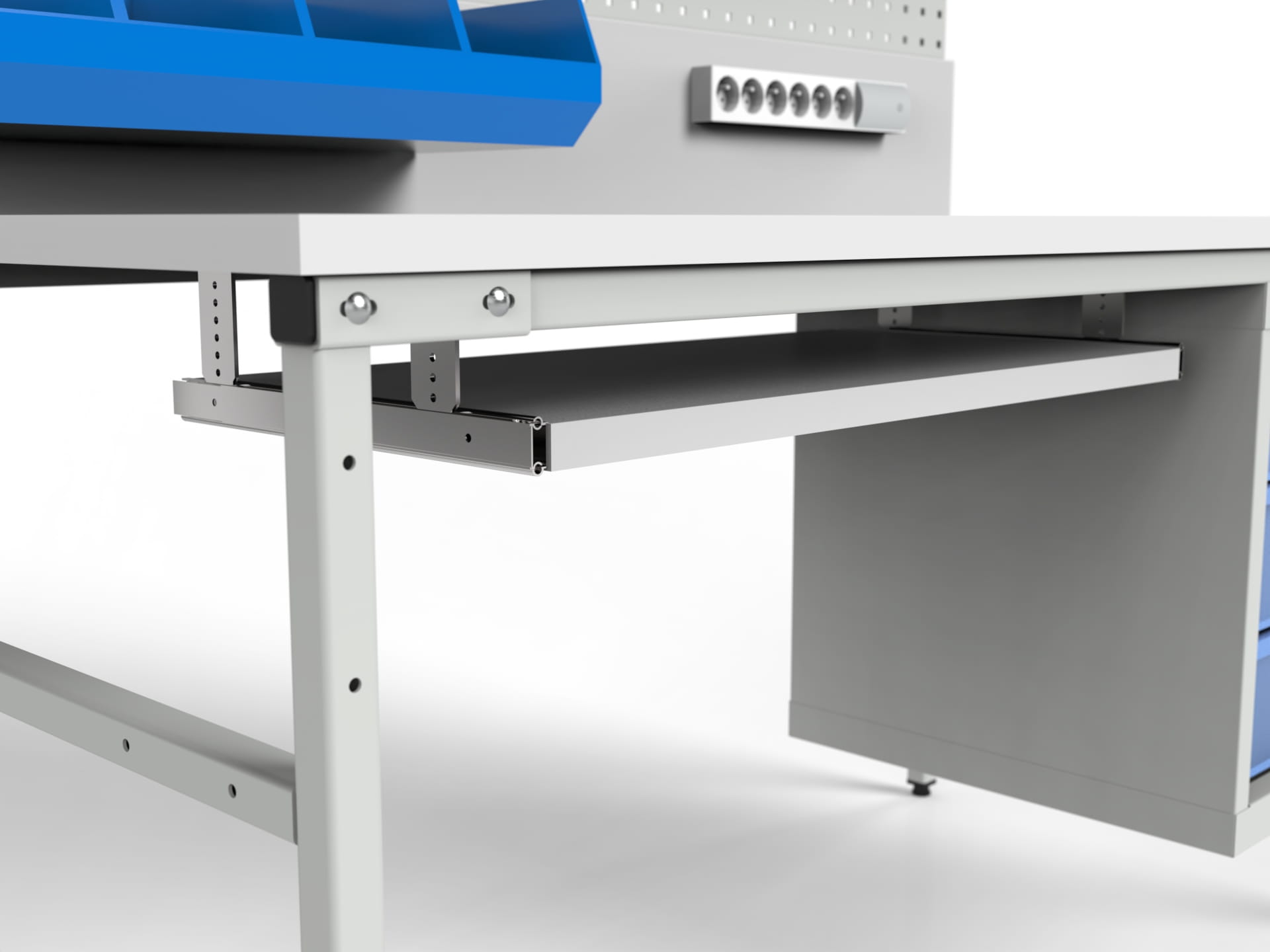 - szafki i szuflady narzędziowe, panele perforowane, uchwyty balansera ułatwiające utrzymanie porządku na stanowisku roboczym