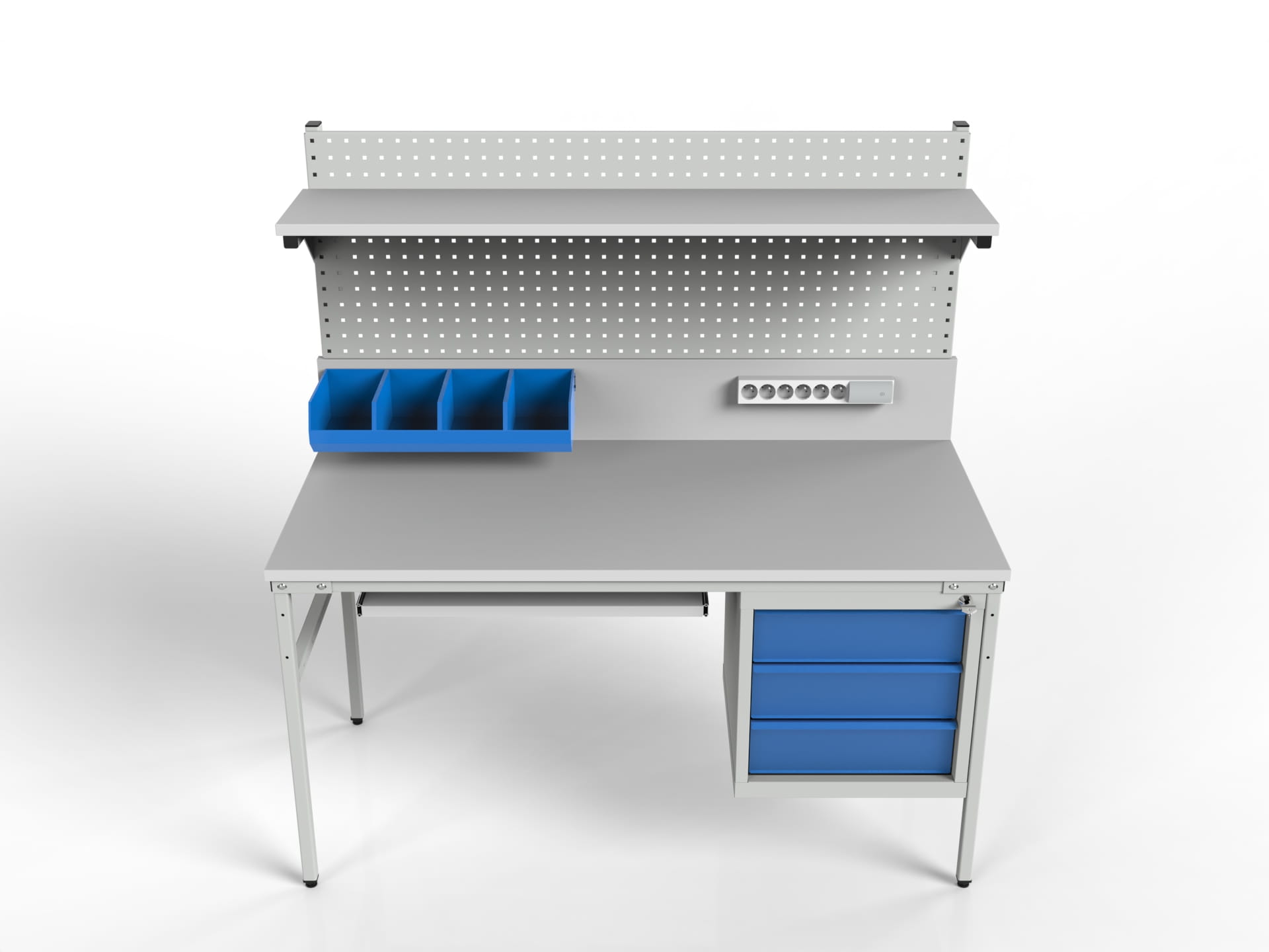 Stół montażowy SMPK1 z półką, ścianką perforowaną i szafką z szufladami na narzędzia