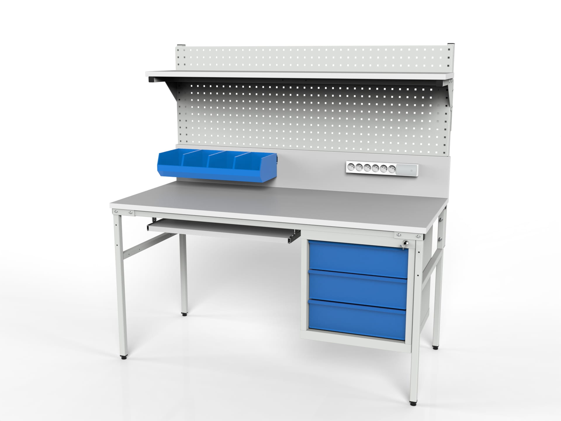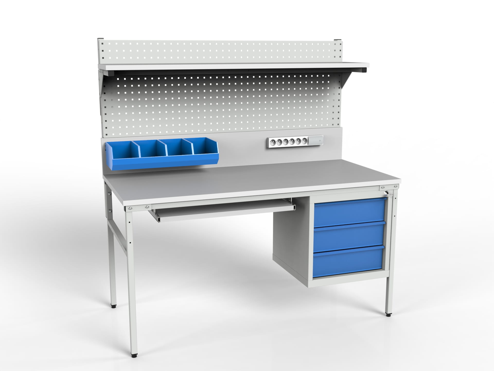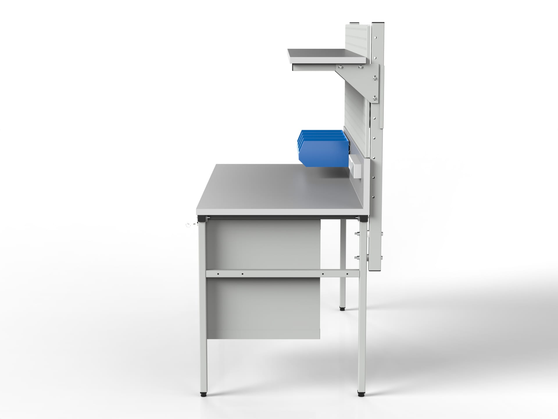 Stół roboczy o stałej wysokości blatu SMPK1 z szafką narzędziową, półką i ścianką perforowaną