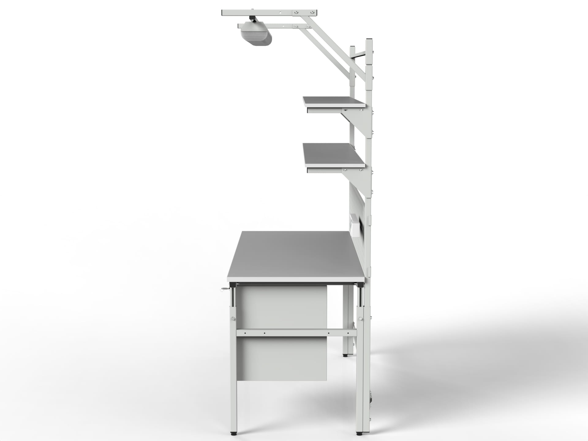 Stół roboczy z regulacją wysokości, dwiema półkami, ścianką i oświetleniem