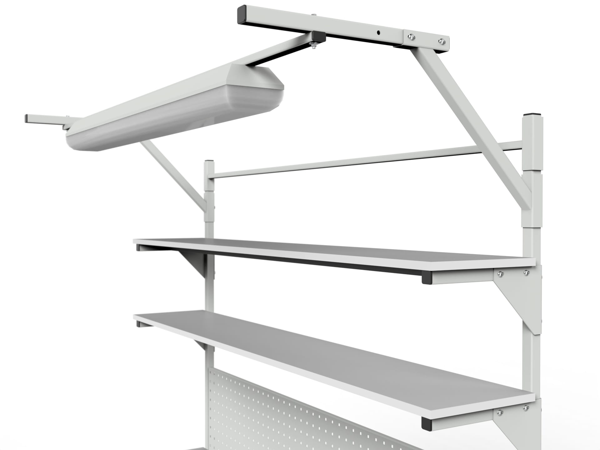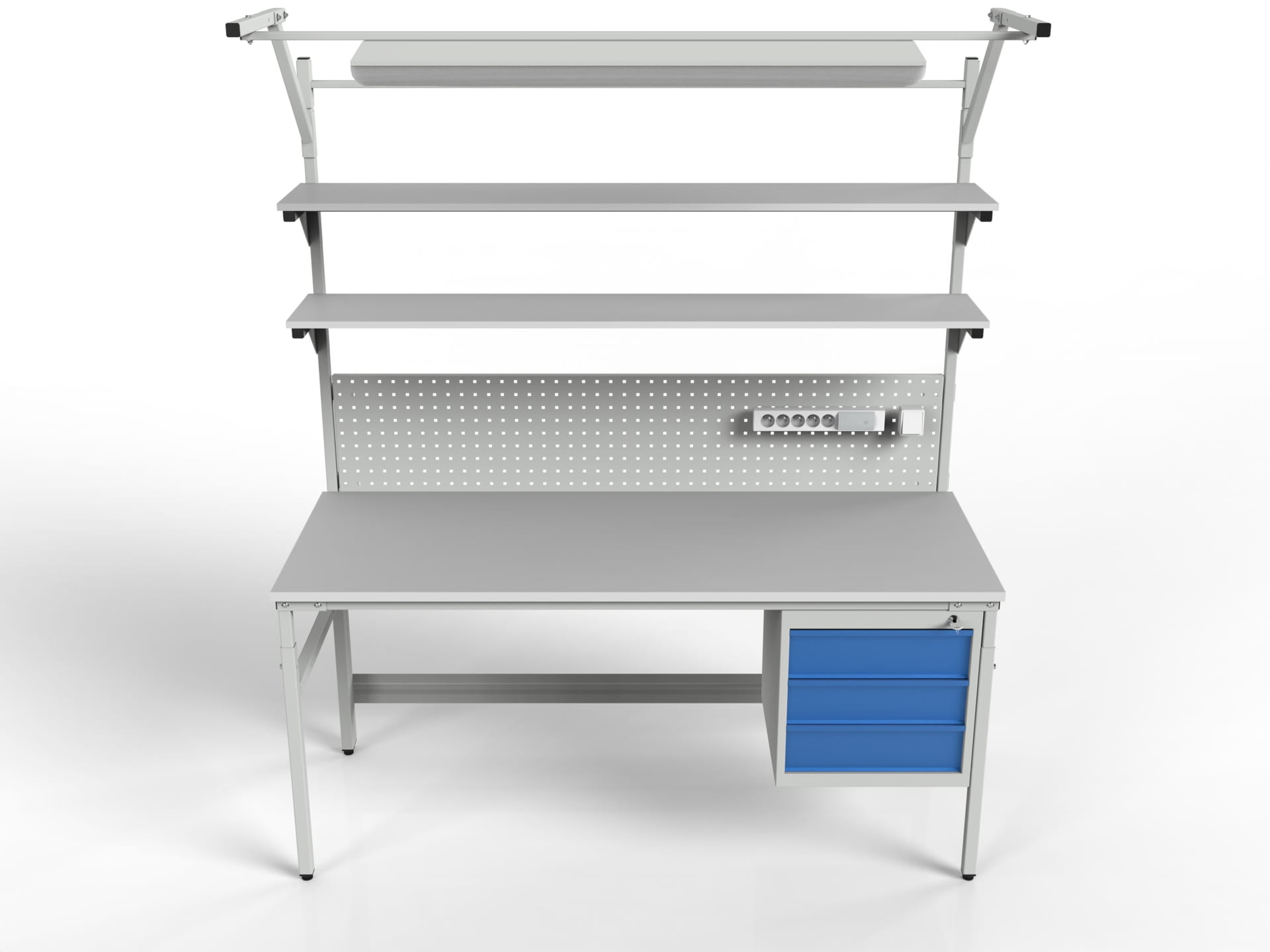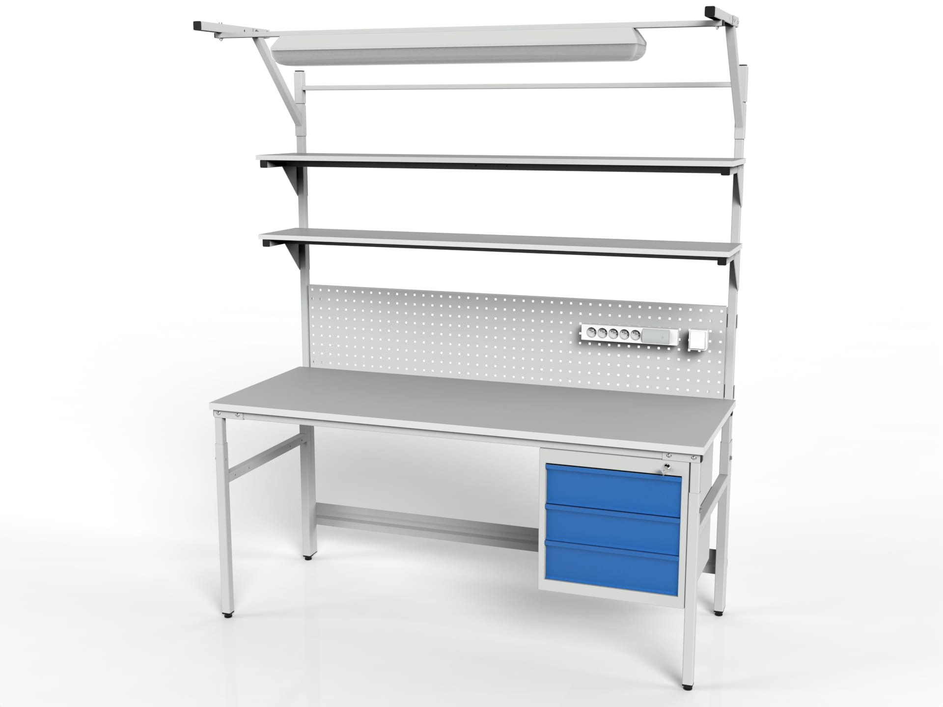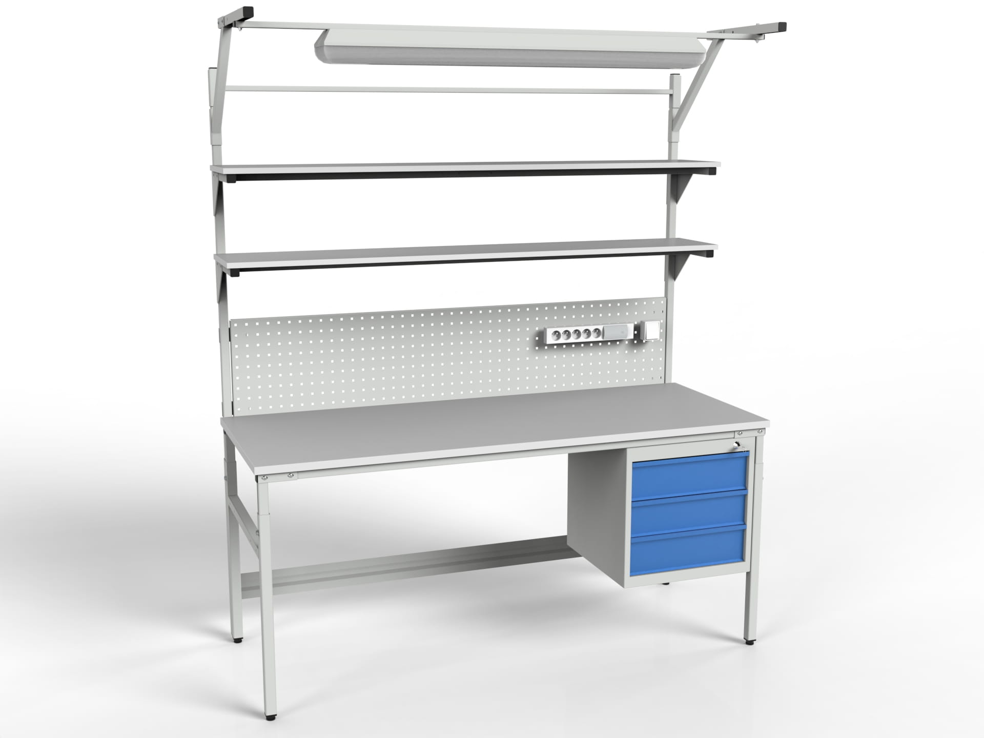 Stół montażowy SMRPK1C z półkami, ścianką perforowaną szafką i oświetleniem centralnym