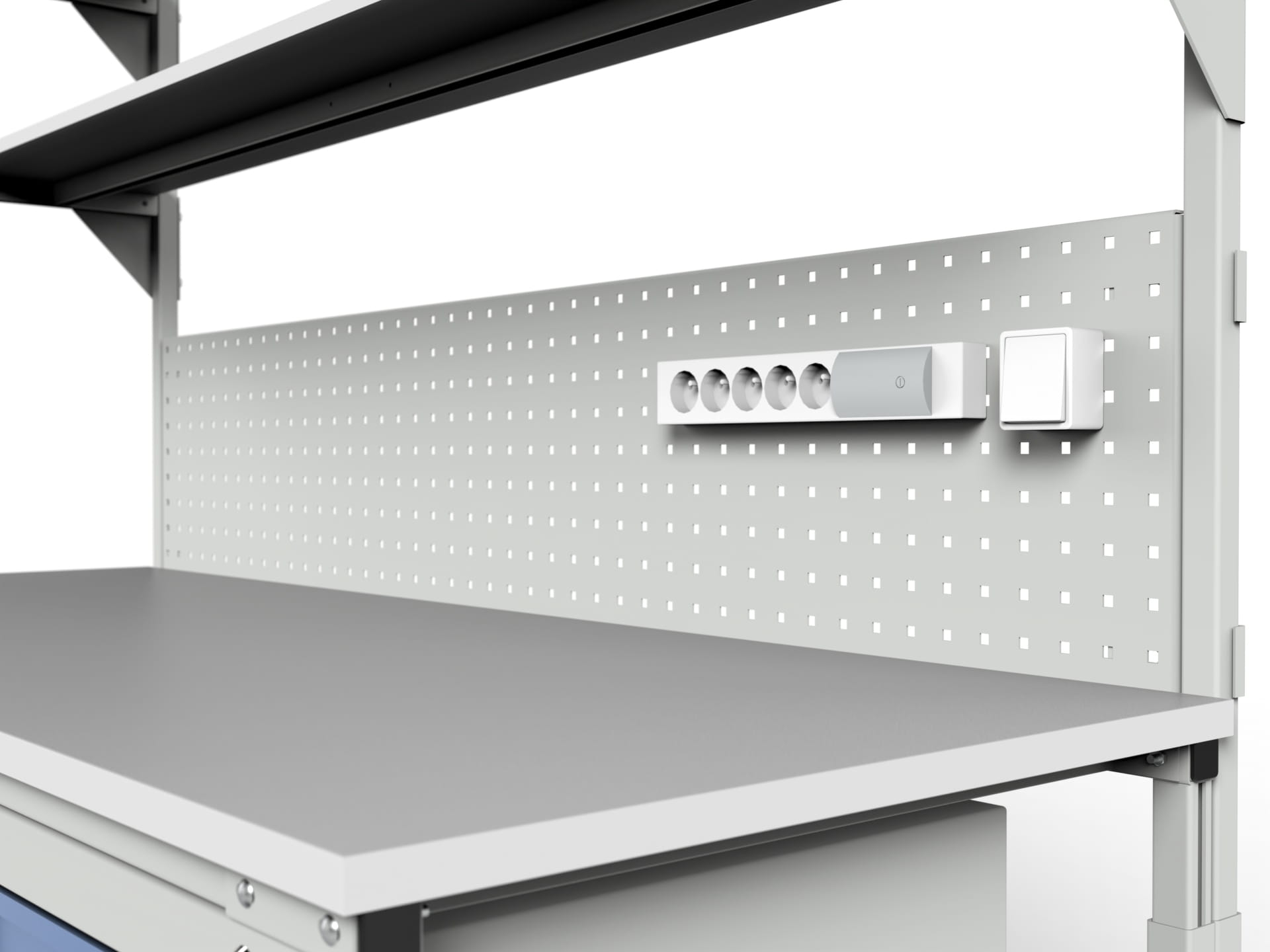- szafki i szuflady narzędziowe, panele perforowane, uchwyty balansera ułatwiające utrzymanie porządku na stanowisku roboczym