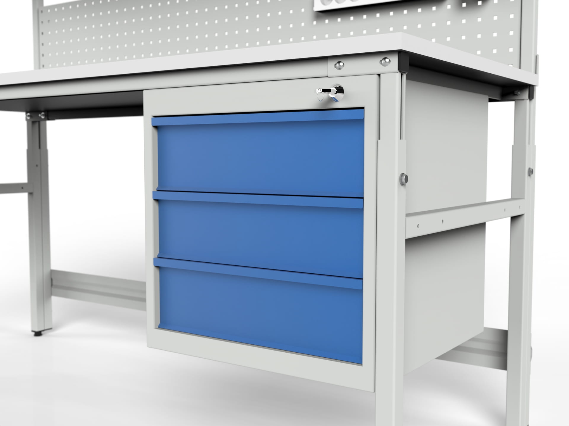 - szafka o wymiarach 500x500x500 mm z trzema szufladami o wysuwie 100%, zamykanymi na zamek centralny
