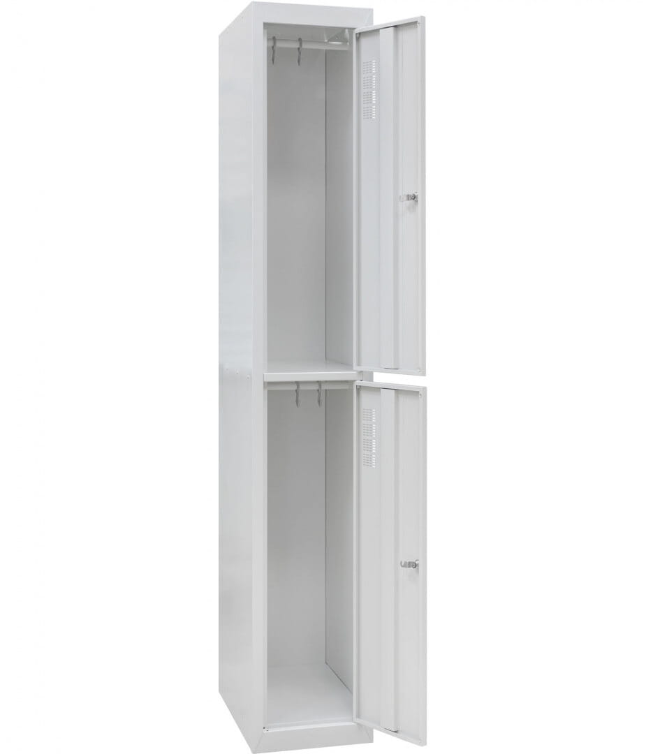 Szafka ubraniowa sprawdzi idealnie gdy chcesz wyposażyć szatnię lub przebieralnię w hali produkcyjnej, zakładzie pracy, instytucji publicznej czy w obiekcie sportowym. Obudowa szafy wykonana została z fosforanowanej stali malowanej proszkowo, co chroni ją przed wilgocią i co za tym idzie - przed korozją. Wygodny wieszak umożliwia sprawne przechowywanie ubrań. Stalowe drzwi zawierają usztywnienie utrudniające odkształcanie, a otwory w górnej części zapewniają wentylację i odprowadzanie zarówno zapachów jak i wilgoci.