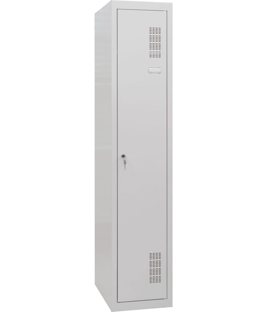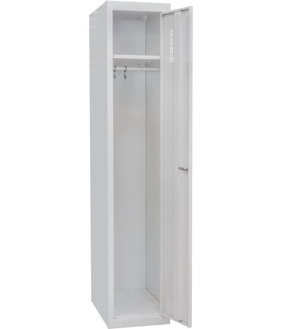 Pojedyncza szafka ubraniowa sprawdza się idealnie gdy potrzebujesz wyposażenia dla szatni lub przebieralni zarówno w zakładzie pracy jak i w domu. Obudowa szafy wykonana jest z fosforanowanej stali malowanej proszkowo, co chroni ją przed wilgocią i co za tym idzie - przed korozją. Solidny wieszak umożliwia wygodne przechowywanie ubrań, a znajdująca się nad nim półka - rzeczy osobistych i drobnego wyposażenia. Stalowe drzwi zawierają wzmocnienie utrudniające deformację a otwory w górnej i dolnej ich części zapewniają wentylację i odprowadzanie zarówno zapachów jak i wilgoci.