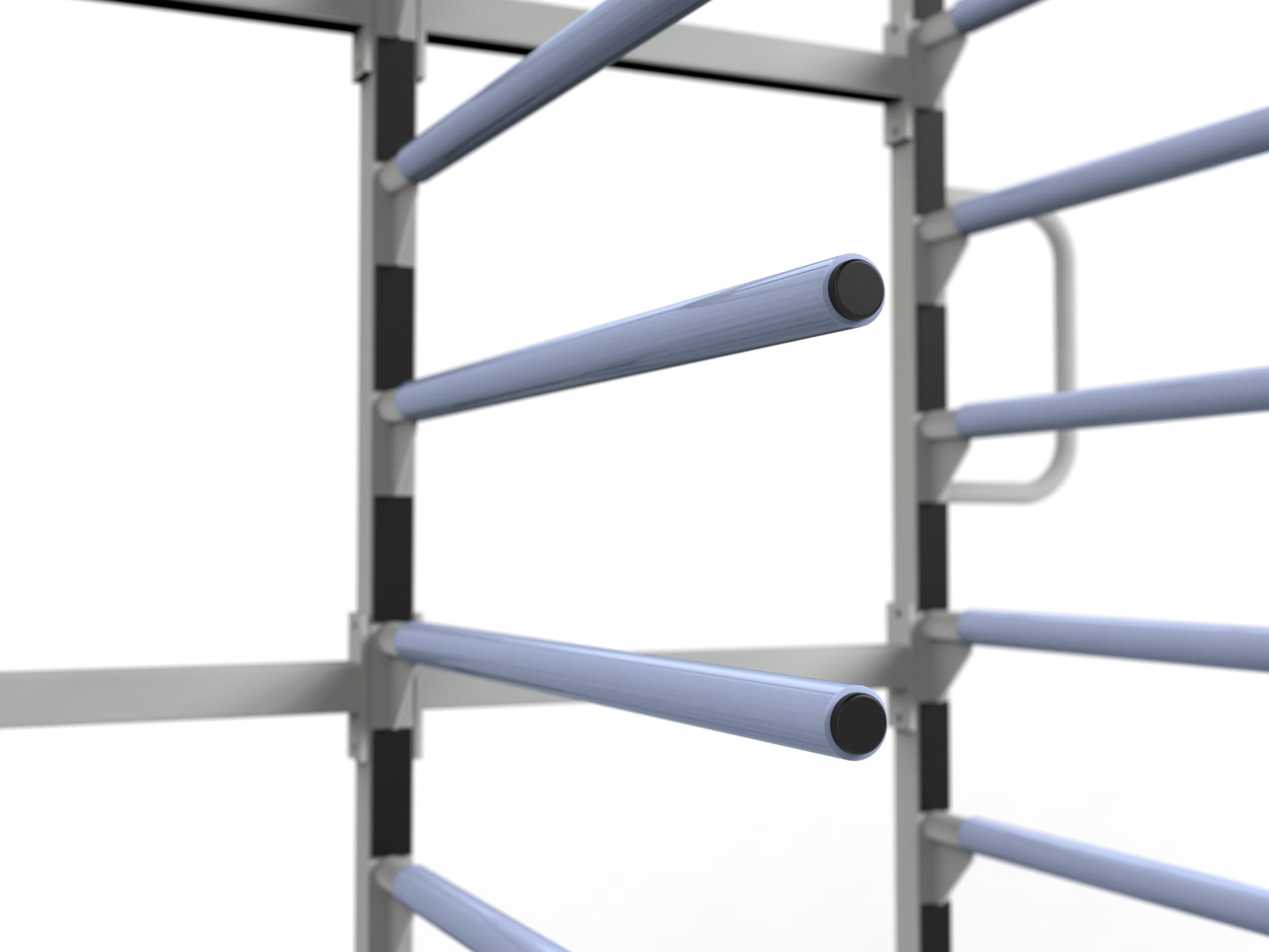 Wszystkie ramiona zabezpieczone wysokiej jakości przezroczystym, niezbrojonym wężem igielitowym o grubości ścianki 3mm. Wąż nałożony na ramiona bardzo ciasno nie ma możliwości aby się zsunął. Wąż elastyczny i mocny. Profile bezpośrednio nad ramionami (ta ścianka do których może dotykać przewożony towar) zabezpieczone naklejoną na nie gumą ryflowaną 3mm. Takie zabezpieczenie zapobiega przypadkowym zarysowaniom podczas użytkowania wózka. Profile poprzeczne łączące ścianki nie zabezpieczone gumą gdyż nie ma takiej potrzeby.