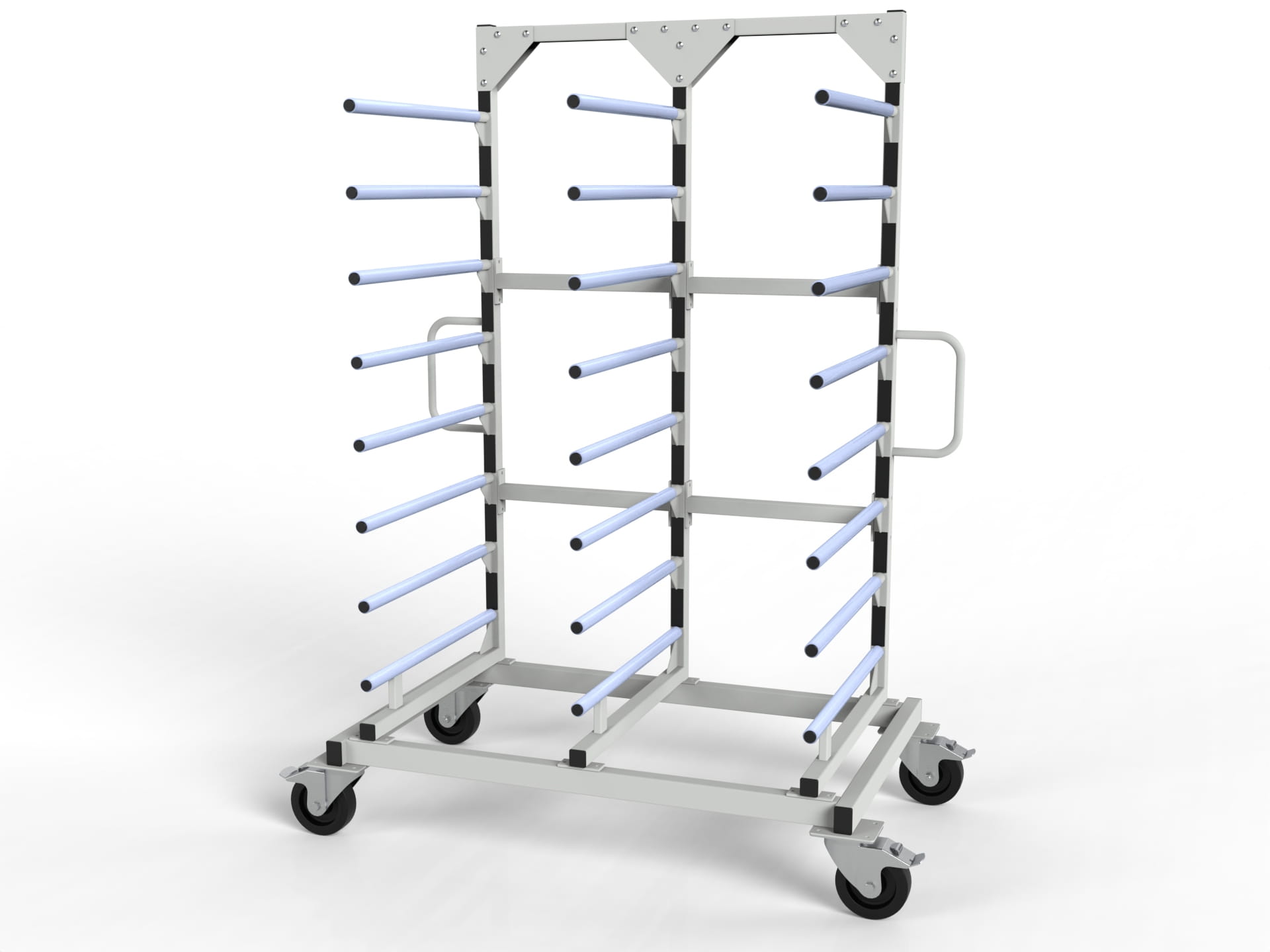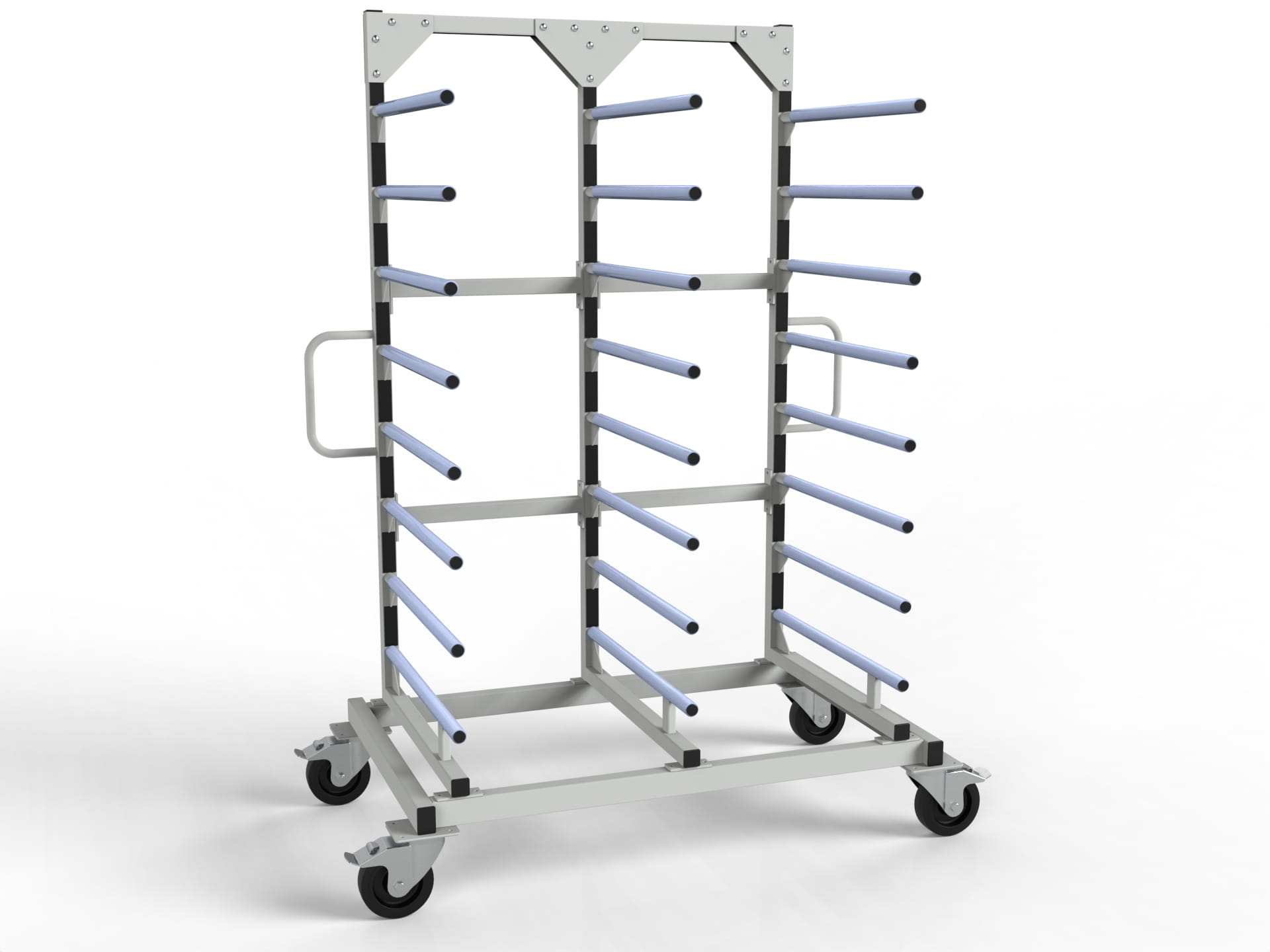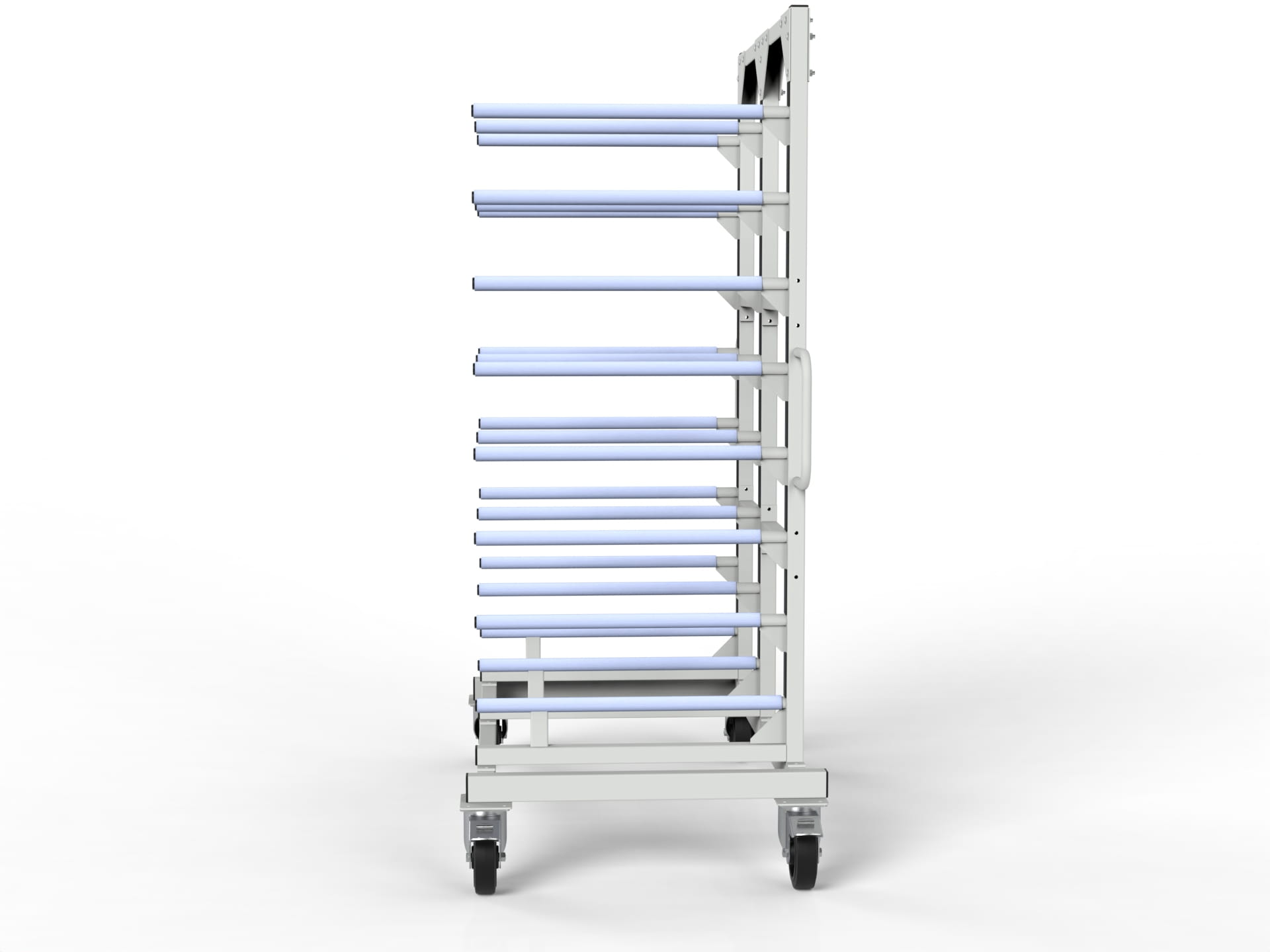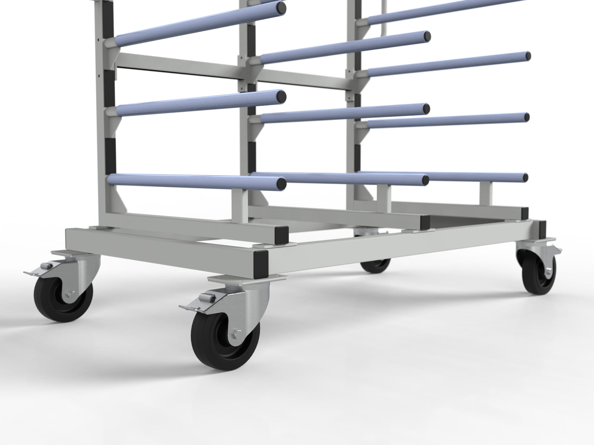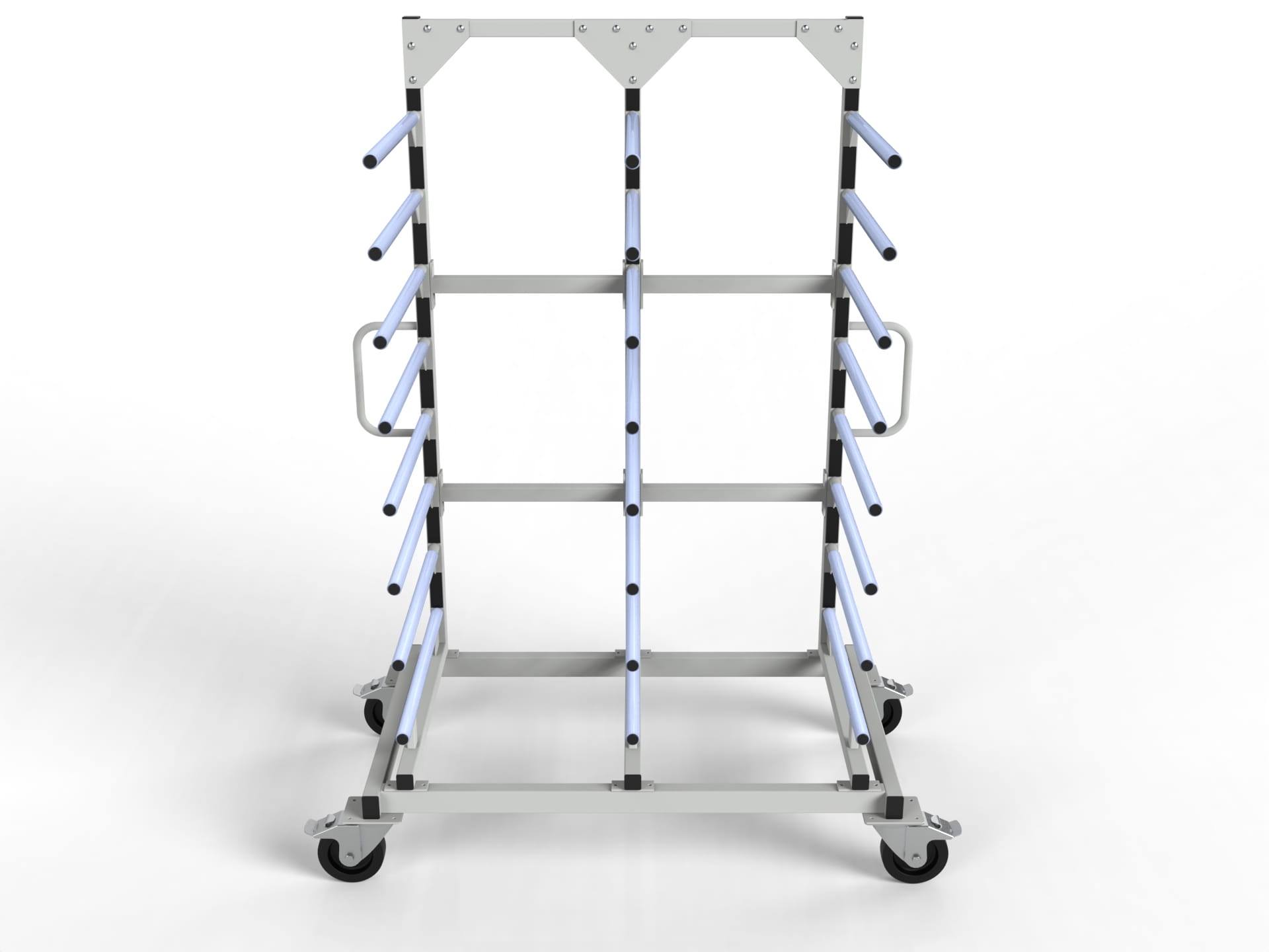 Regał jezdny wyposażony jest w cztery koła obrotowe z hamulcem o średnicy 160mm. Wózek posiada po jednym uchwycie po lewej i po prawej stronie. Stalowa konstrukcja malowana proszkowo w kolorze RAL7035 (jasnoszary).
