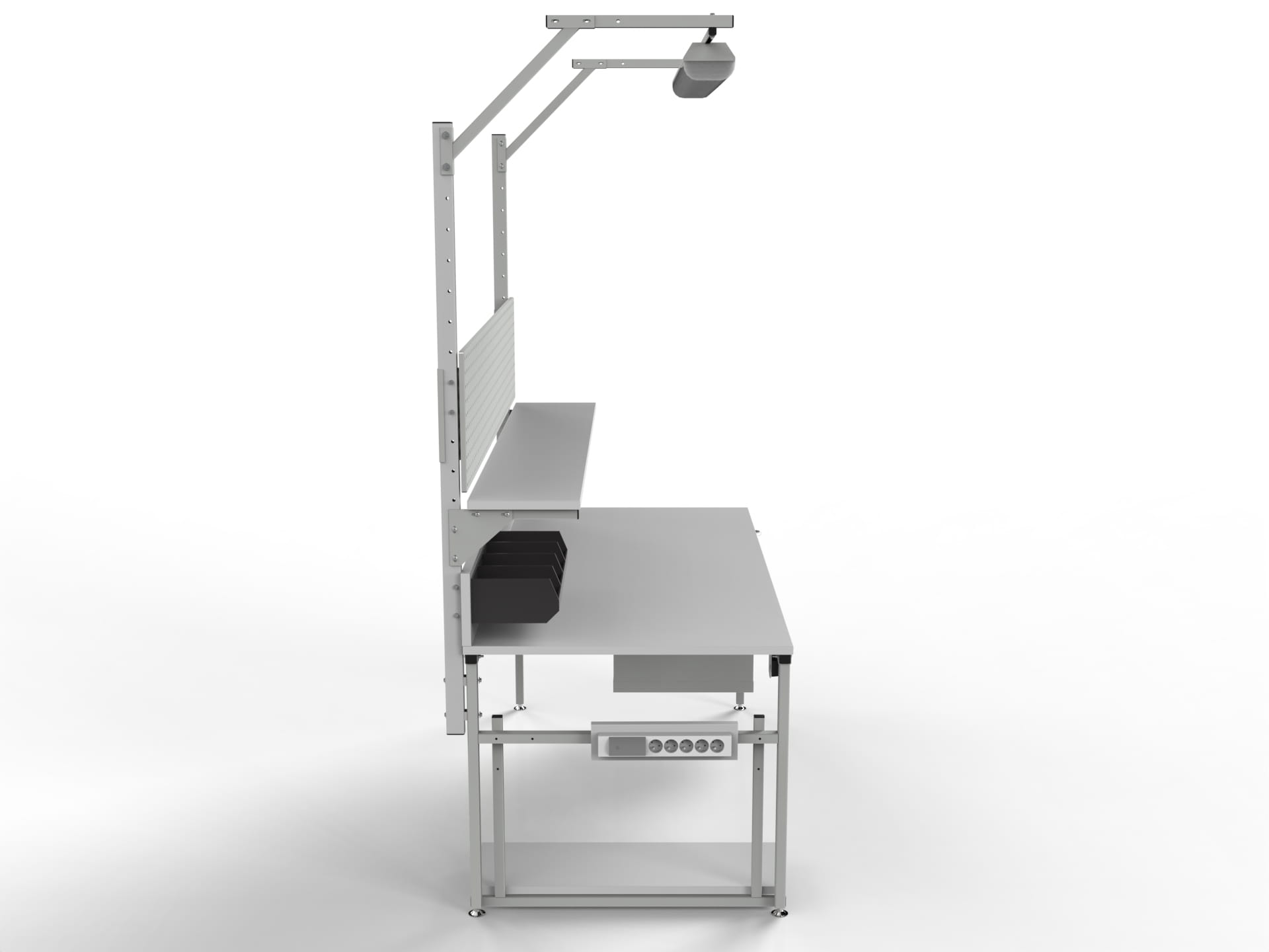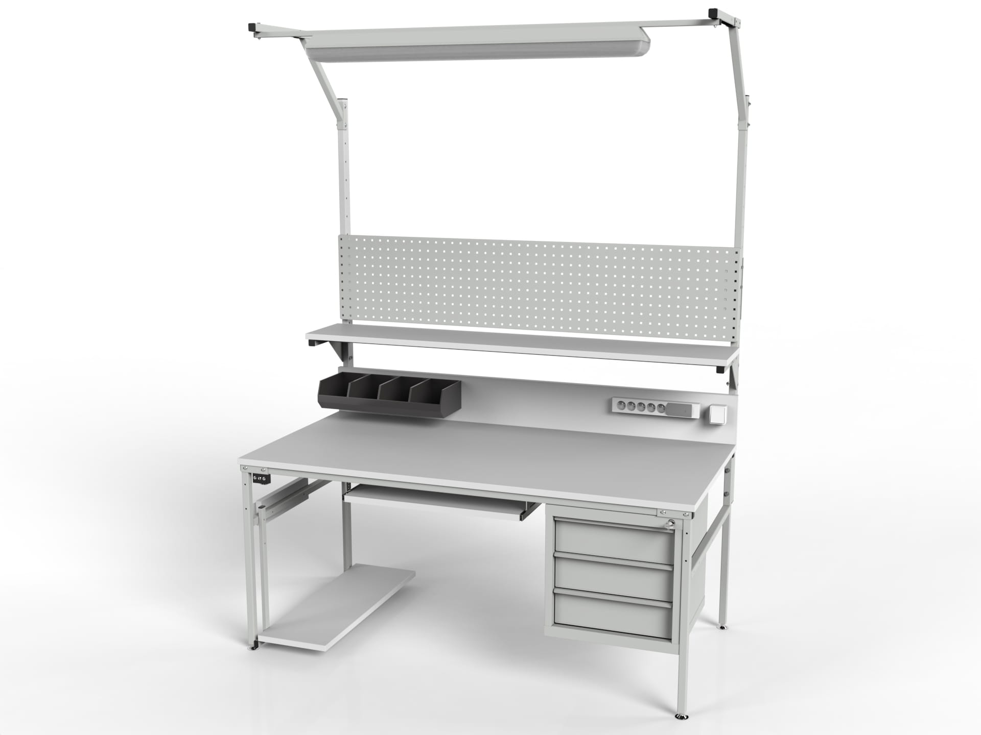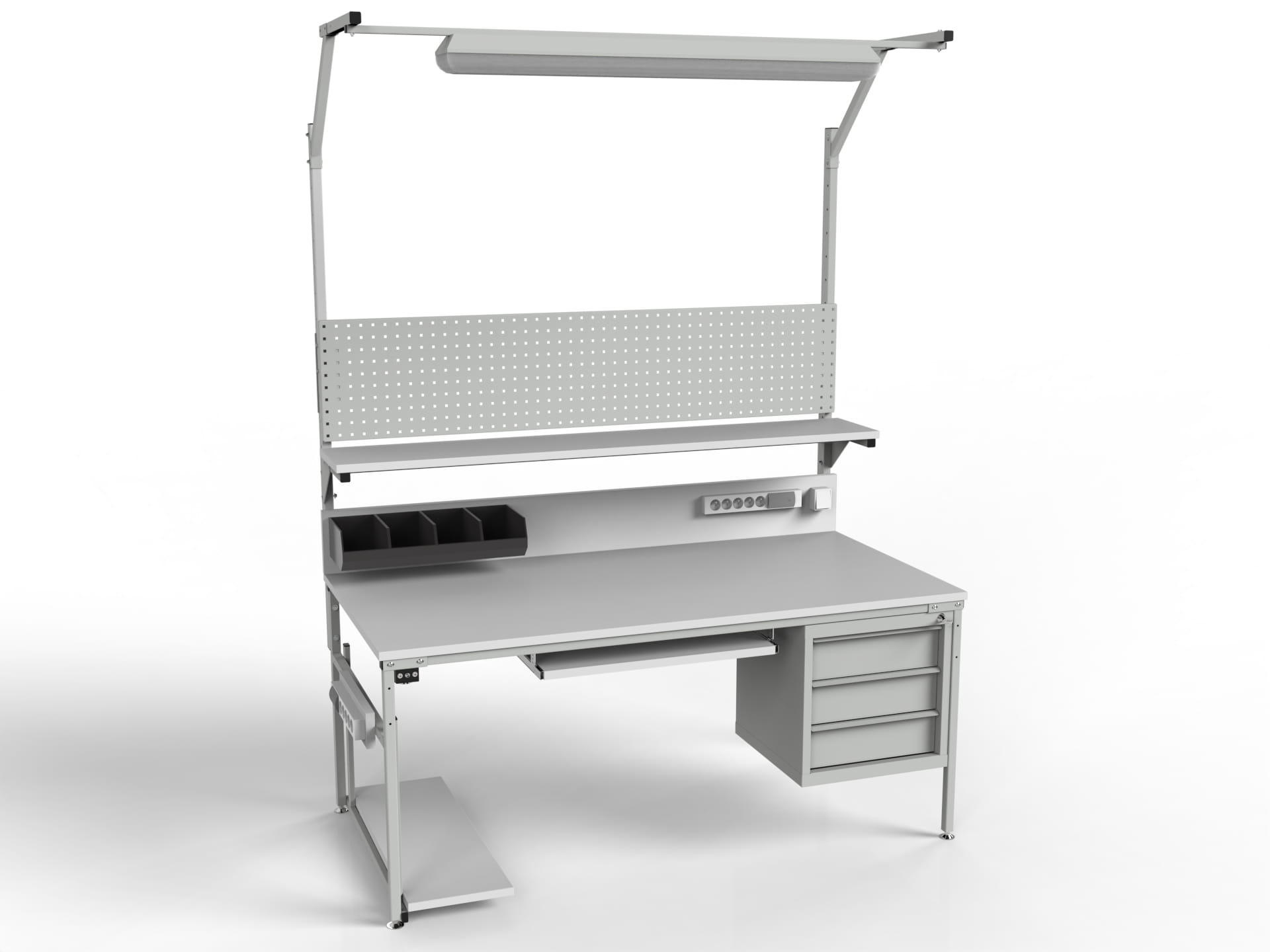 STÓŁ MONTAŻOWY ESD MODEL SMPCK1 Z PÓŁKĄ, SZAFKĄ Z TRZEMA SZUFLADAMI I OŚWIETLENIEM ORAZ WYPOSAŻENIEM DODATKOWYM