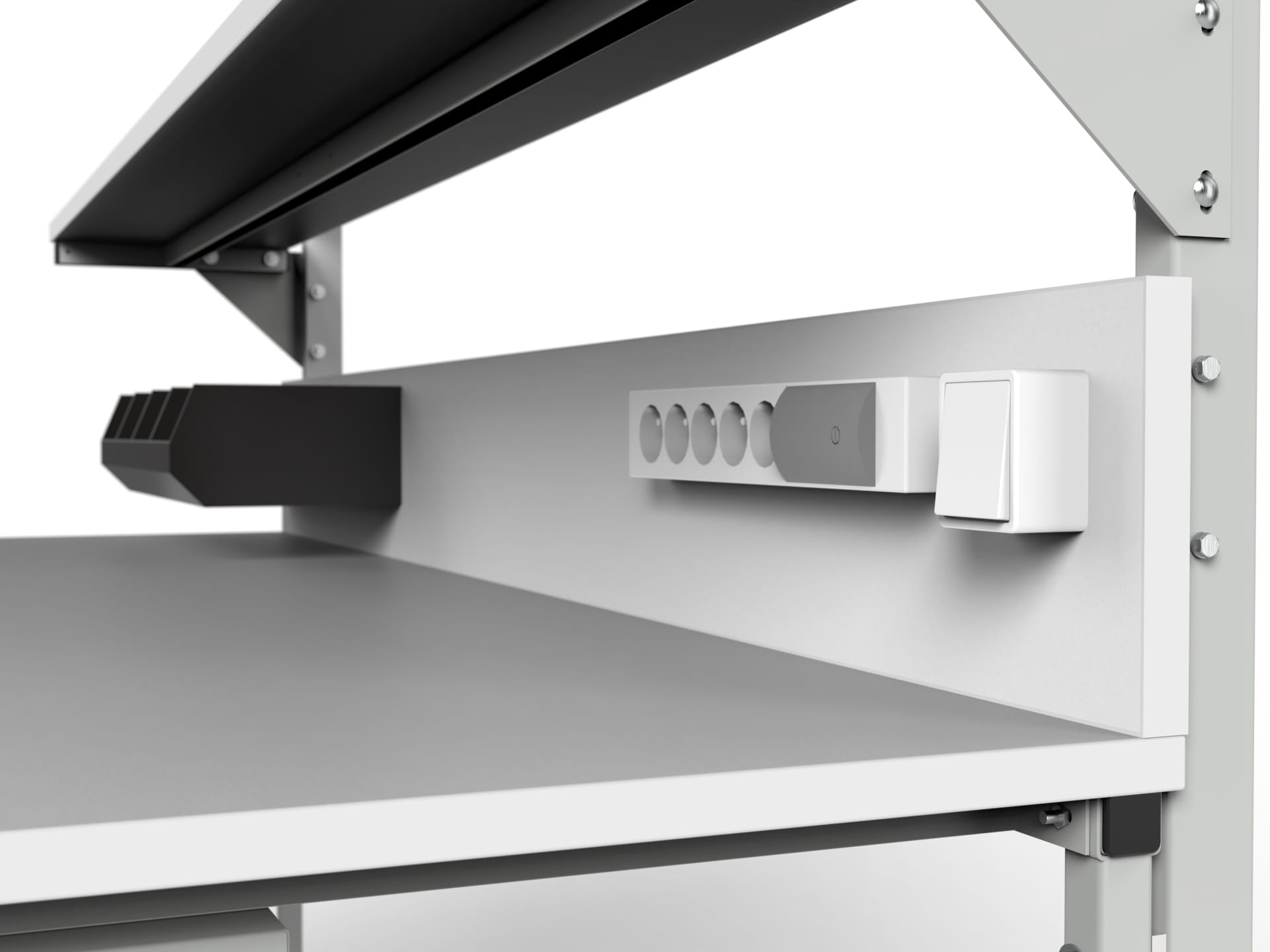 4) Półka wsparta na konstrukcji metalowej o szerokości 300 mm i długości stołu. Wysokość regulowana skokowo co 80 mm. Półka wykonana z płyty wiórowej przewodzącej ESD melaminowanej, grubości 25 mm. Opcjonalna możliwość regulacji półki pod kątem 45 stopni,