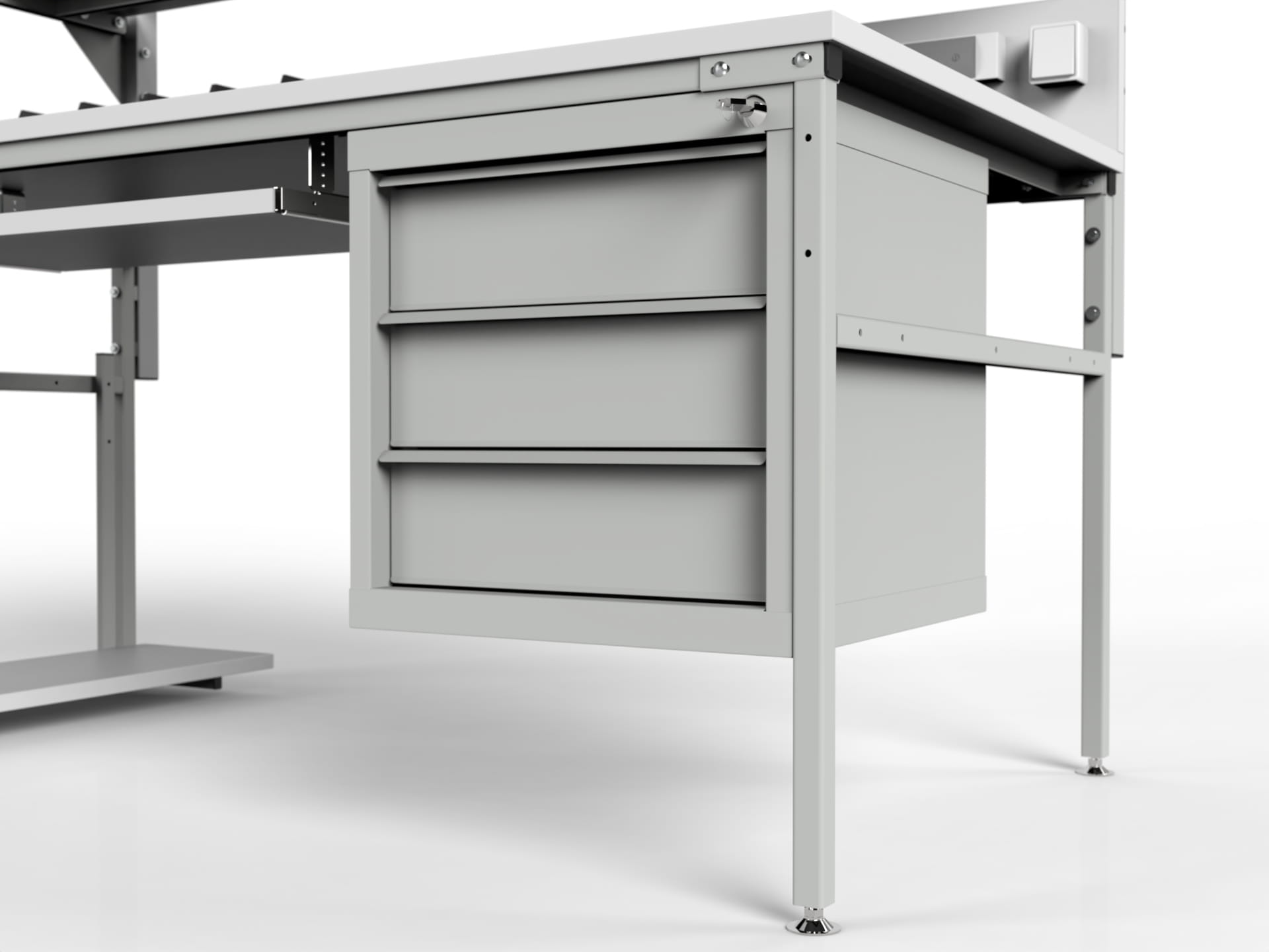 3) Stół wyposażony jest w metalowy kontener 500x500x500 K1 z trzema szufladami o głębokości 125 mm z zamkiem centralnym do wyboru (możliwość umieszczenia z lewej lub prawej strony):
