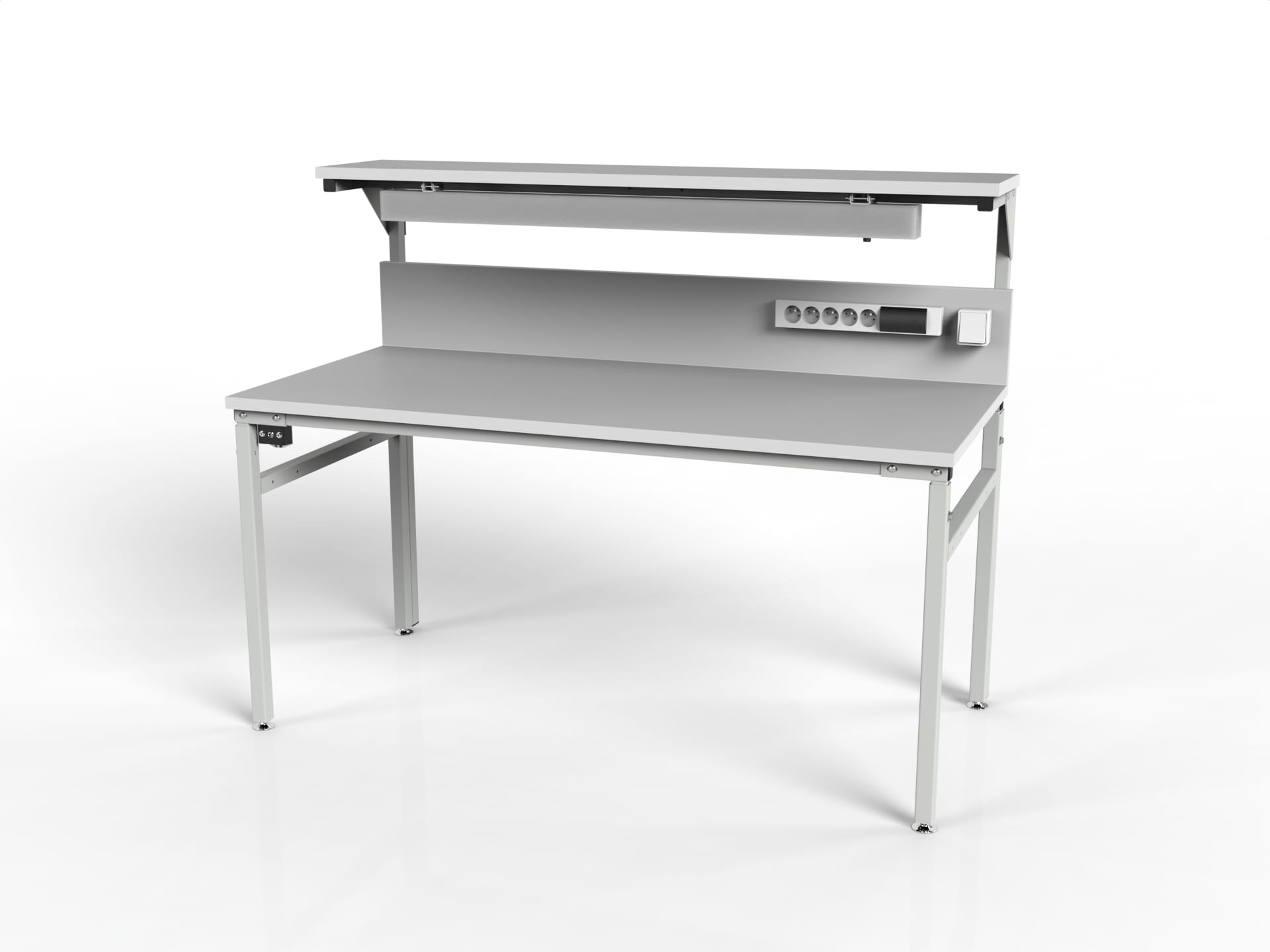STÓŁ MONTAŻOWY ESD REGULOWANY MODEL SMR Z PÓŁKĄ, OŚWIETLENIEM PODPÓŁKOWYM I LISTWĄ ZASILAJĄCĄ.