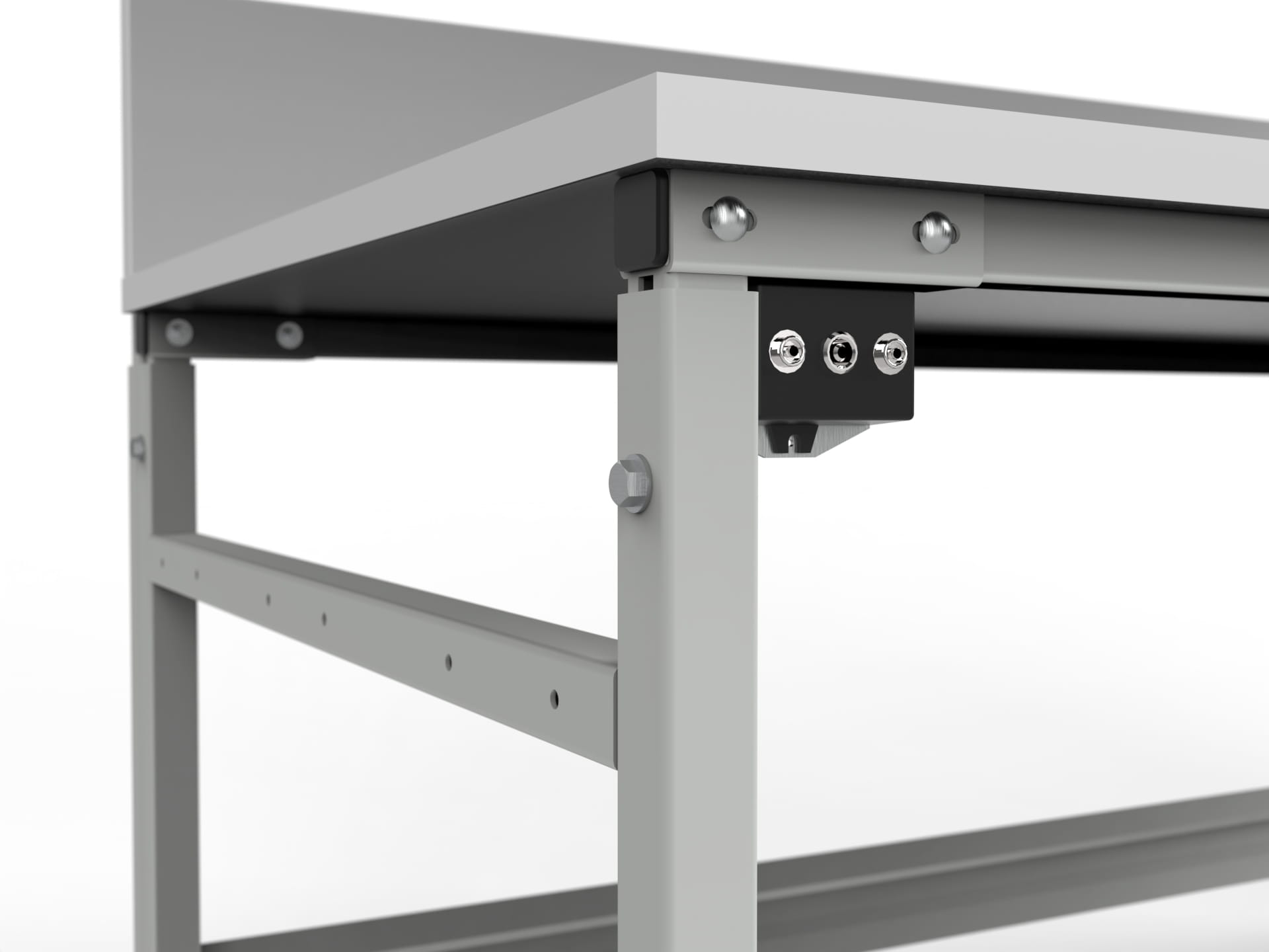 2) Płynna regulacja wysokości blatu biurka ESD w zakresie 750-1150 mm na czterech śrubach.