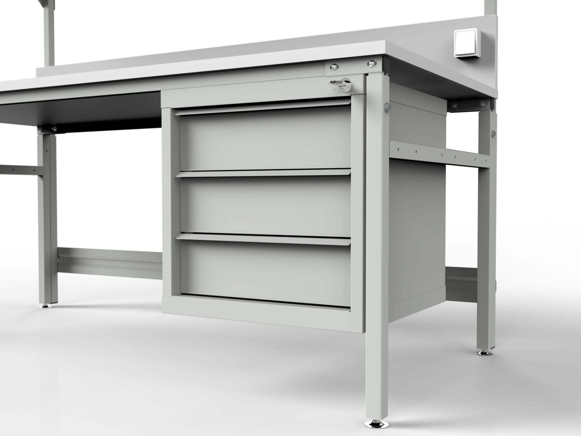4) Stół monterski ESD wyposażony w metalowy kontener 500x500x500 lub pojedynczą szufladę z zamkiem centralnym do wyboru (możliwość umieszczenia z lewej lub prawej strony):
