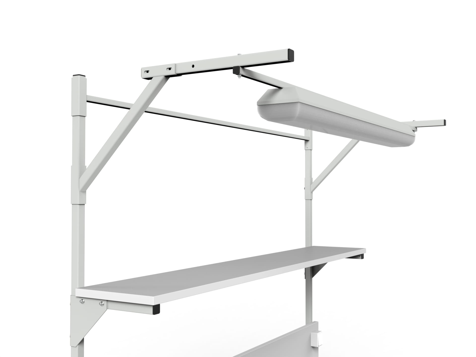 6) Dwie półki ESD o głębokości 300 mm, długości stołu i grubości 25 mm. Wsparte na metalowej konstrukcji, regulowane niezależnie od blatu w zakresie 1200-1600 mm od podłogi. Opcjonalnie możliwość regulacji półki pod kątem 45 stopni.