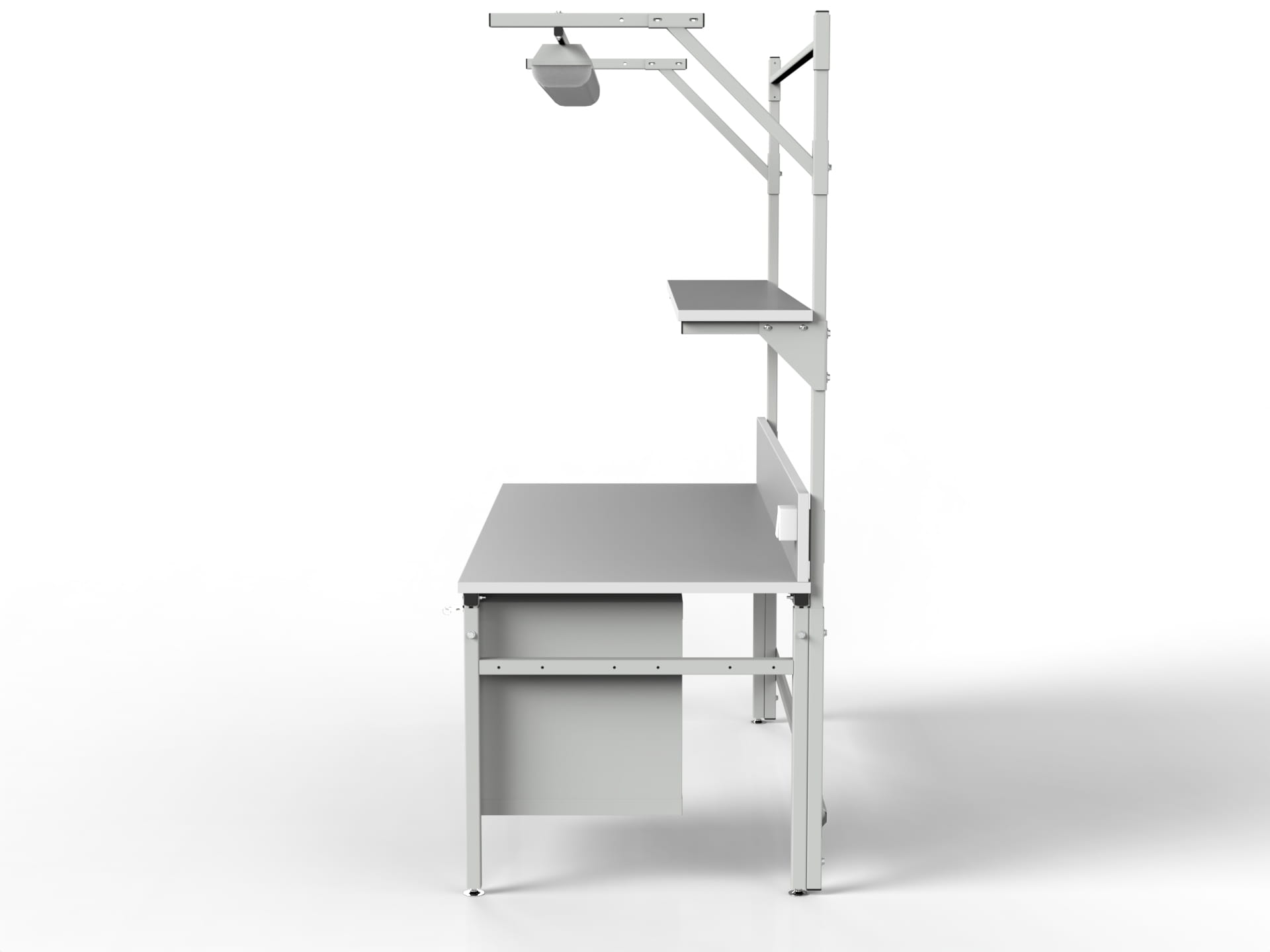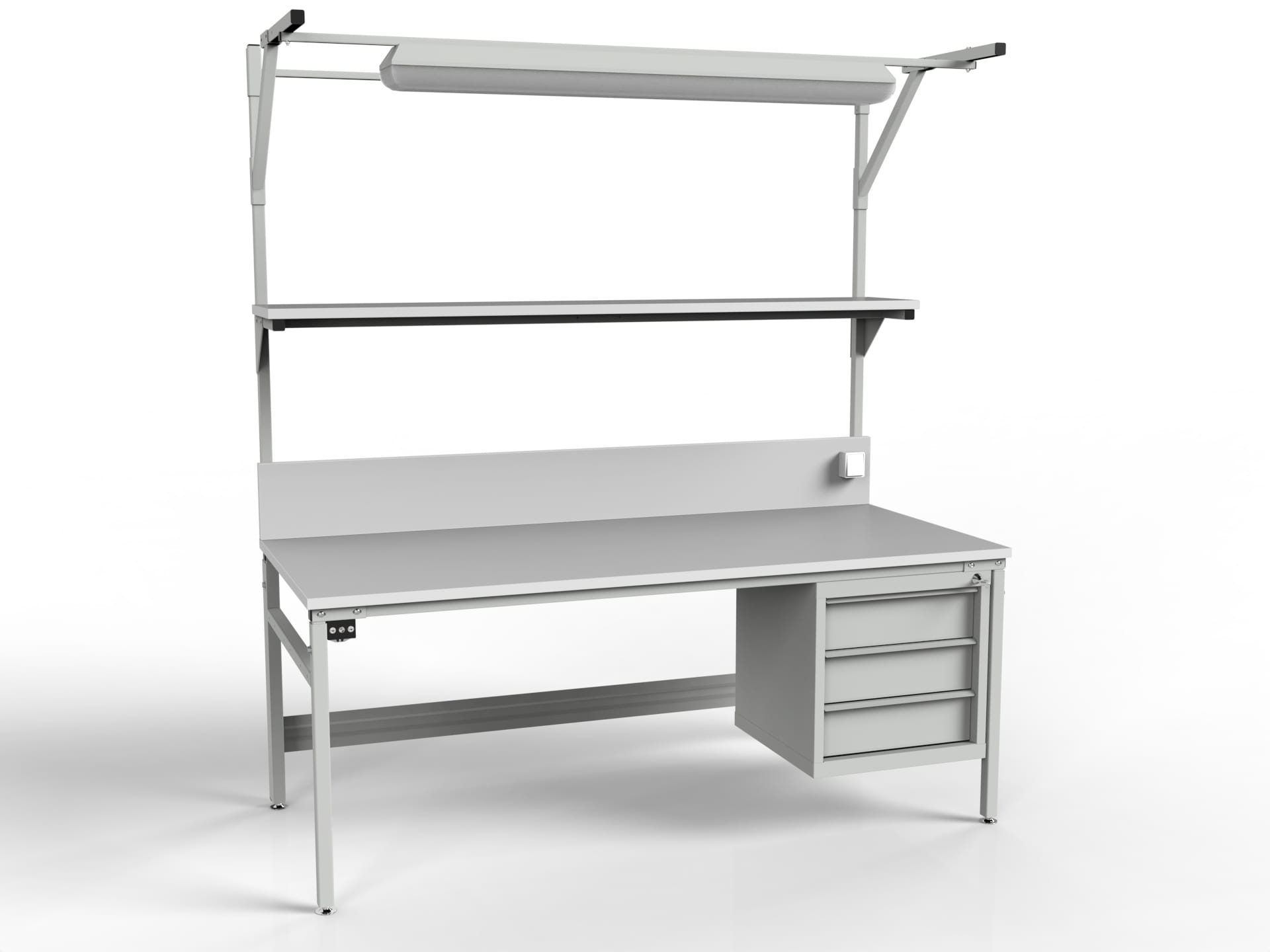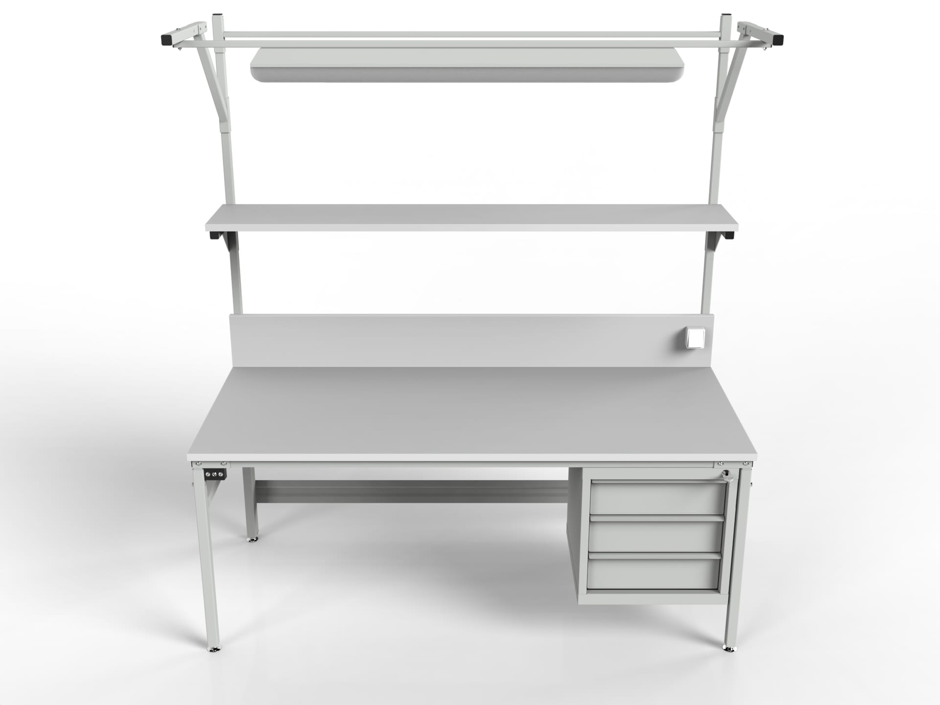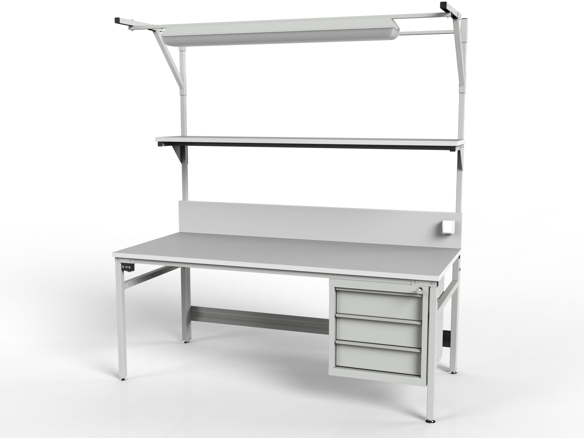 STÓŁ MONTAŻOWY REGULOWANY ESD MODEL SMRPCK1 Z PÓŁKĄ, SZAFKĄ Z TRZEMA SZUFLADAMI I OŚWIETLENIEM