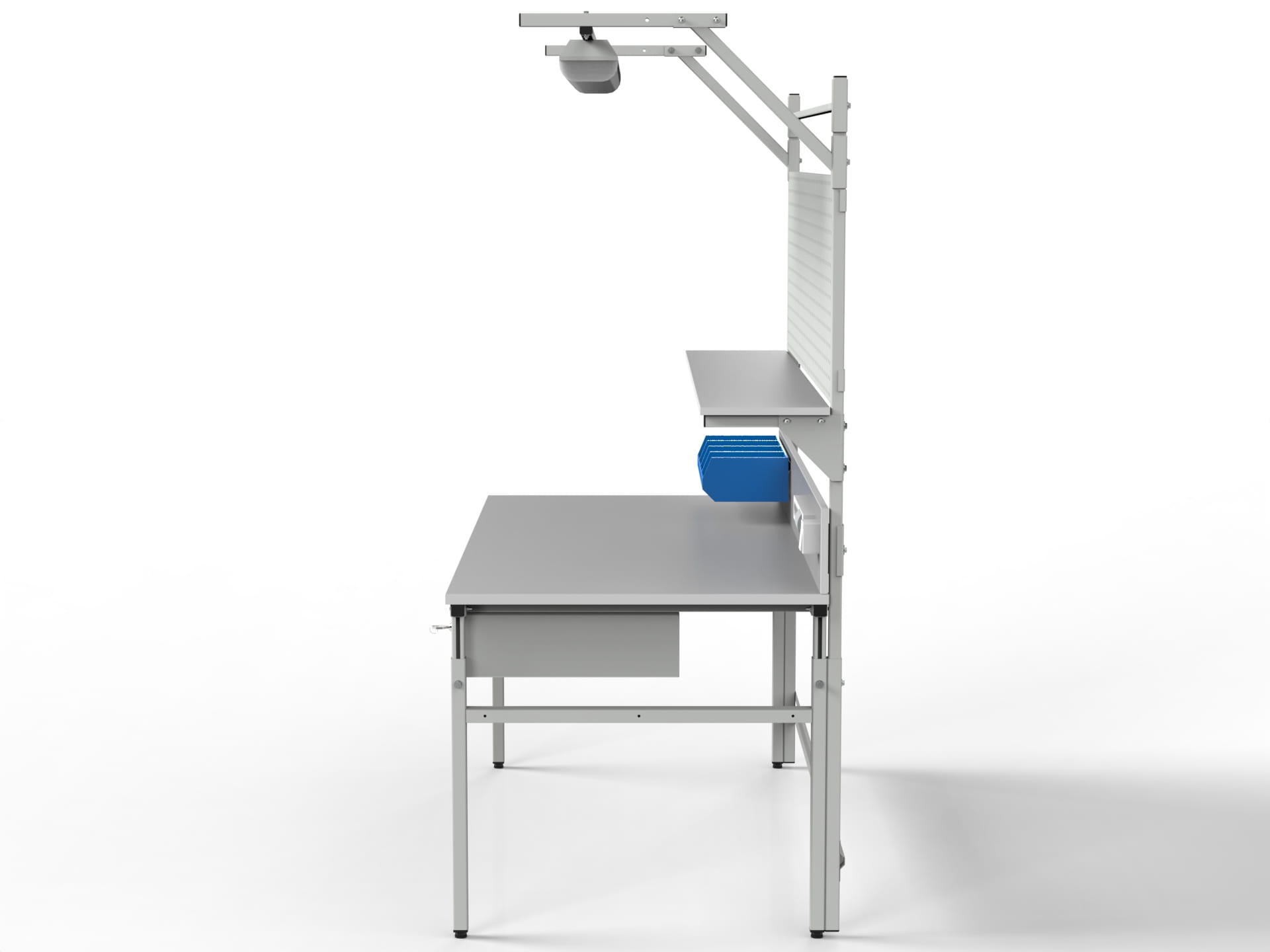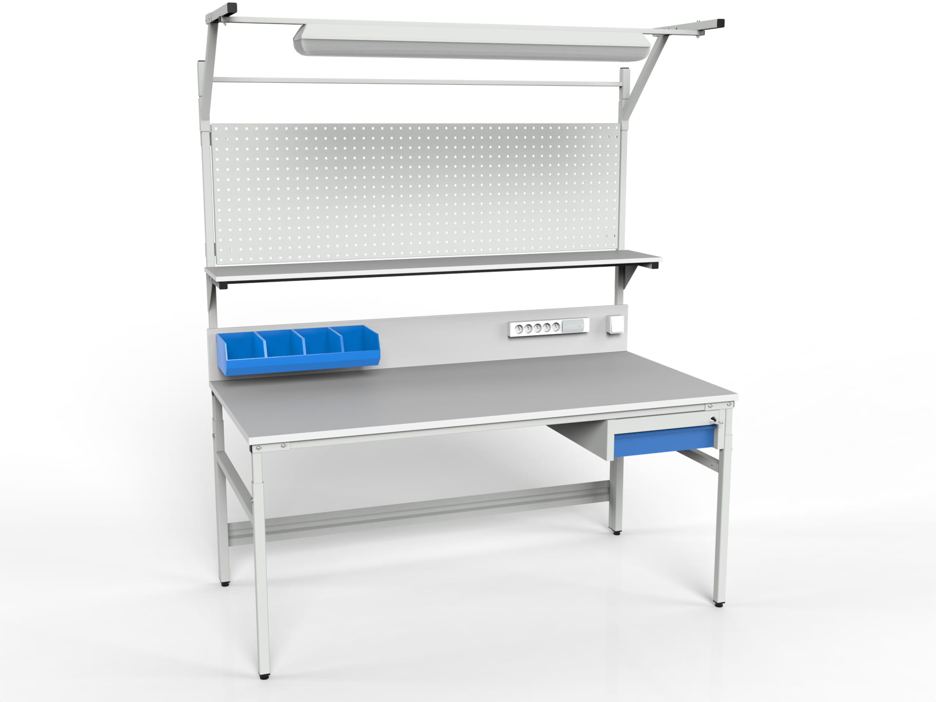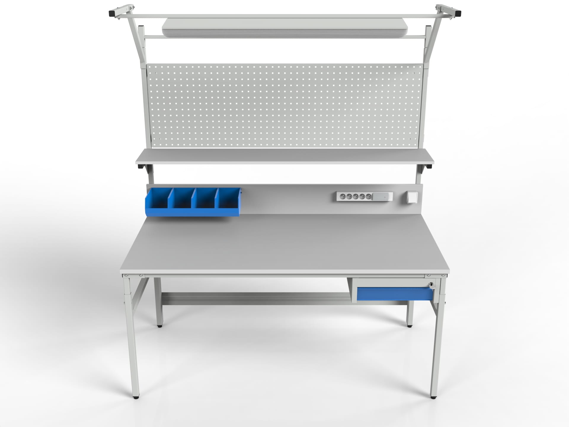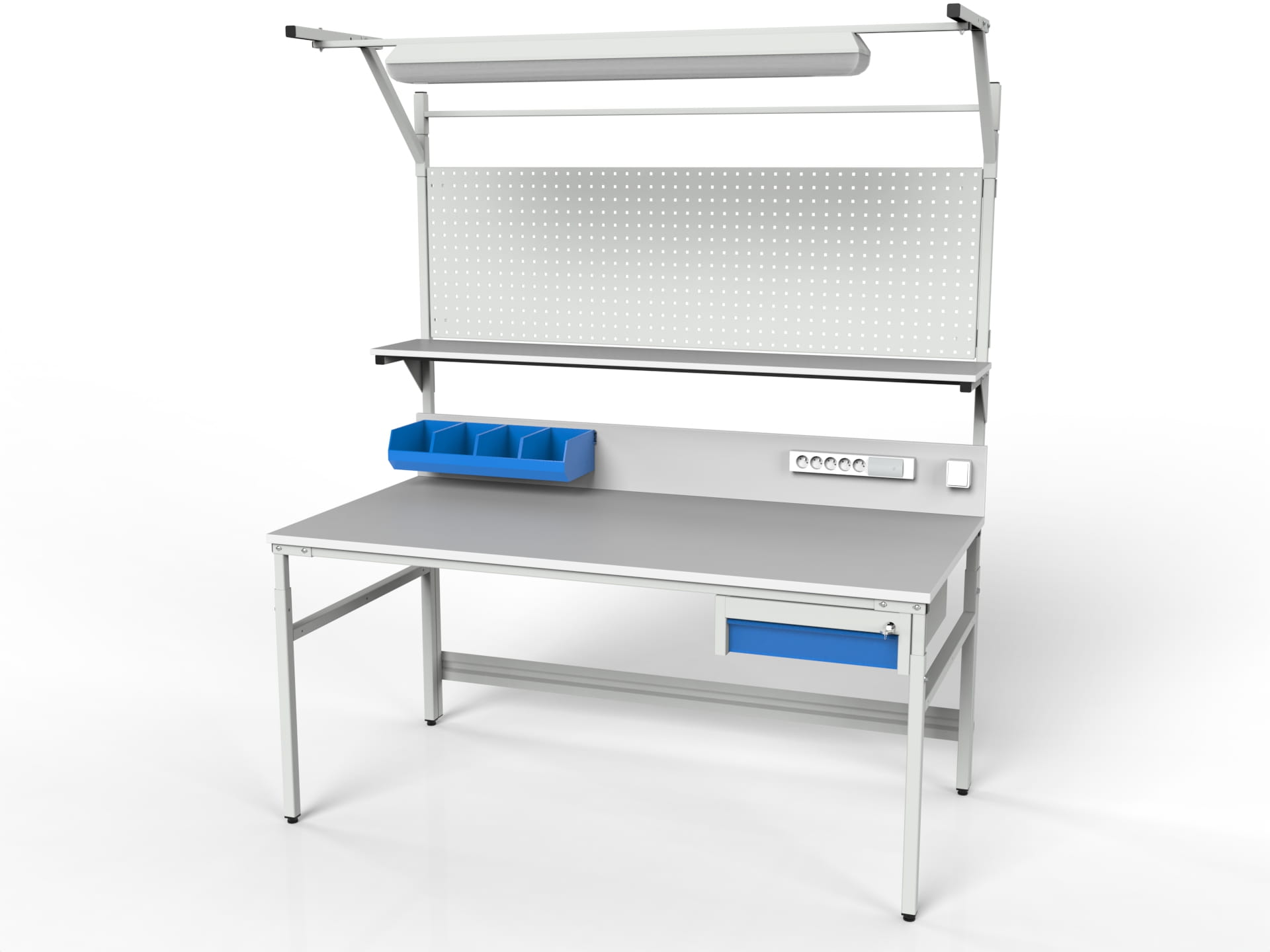 Stół monterski z regulacją wysokości, centralnym oświetleniem, półką , szafką, tylną ścianką, ścianką perforowaną.