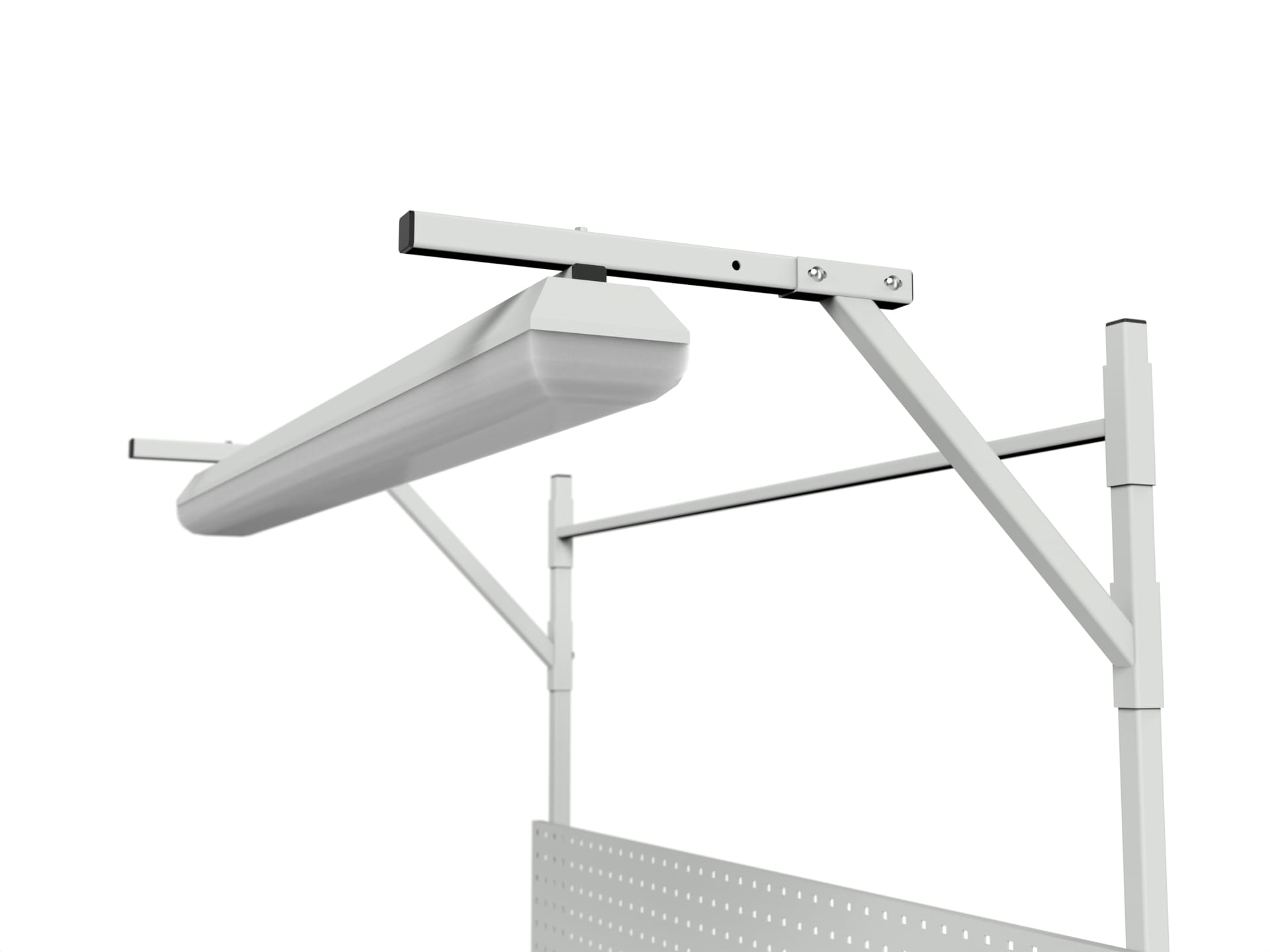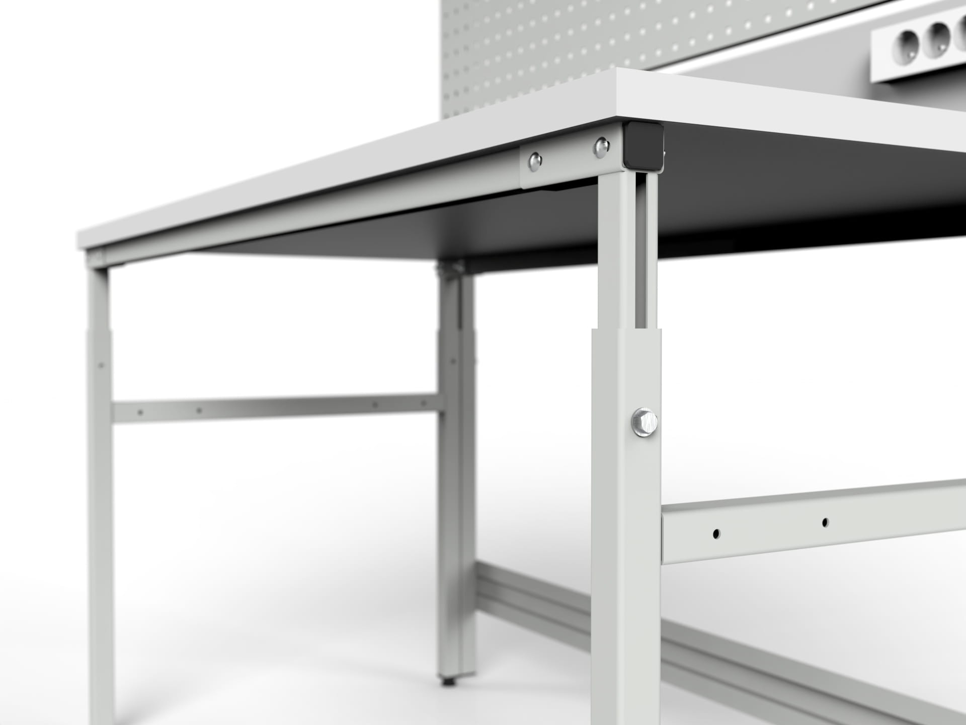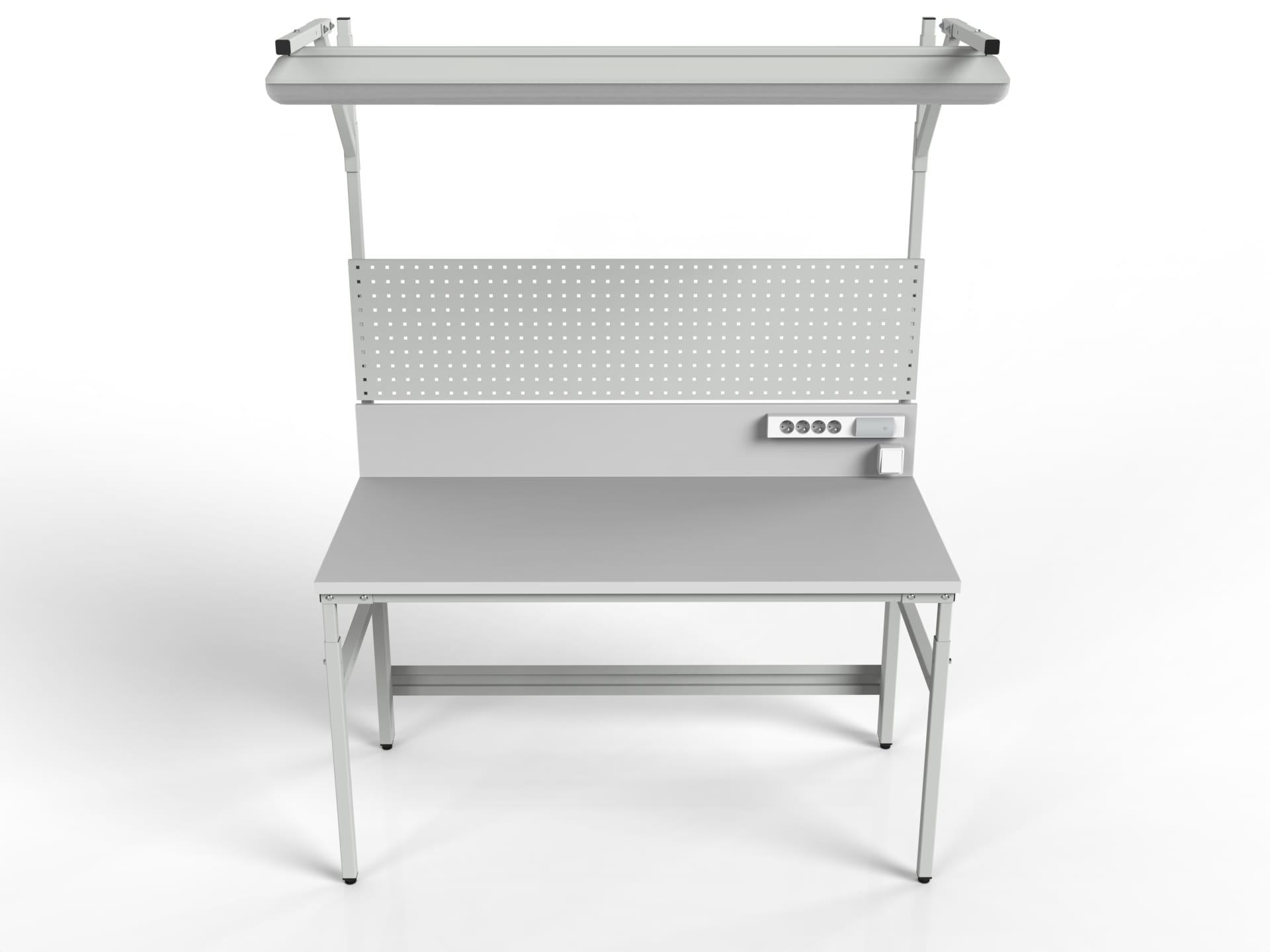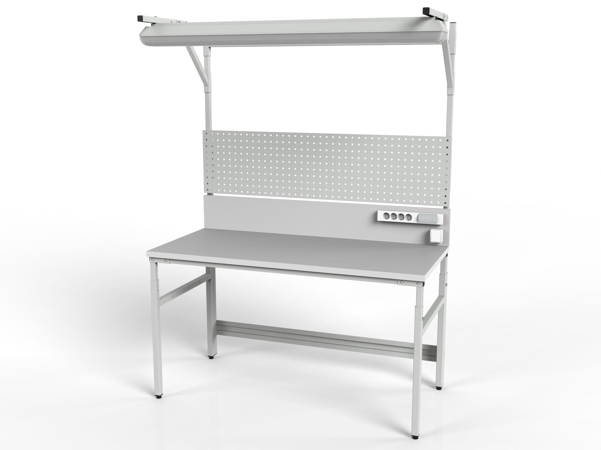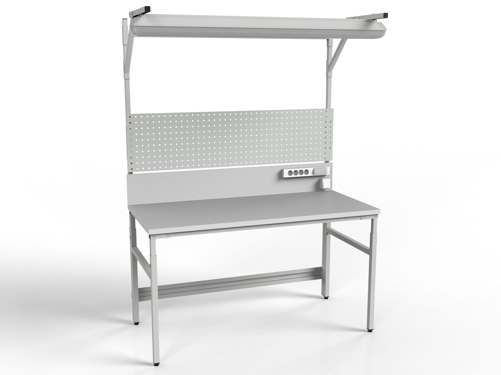 Stół roboczy z regulacją wysokości, centralnym oświetleniem, tylną ścianką, ścianką perforowaną