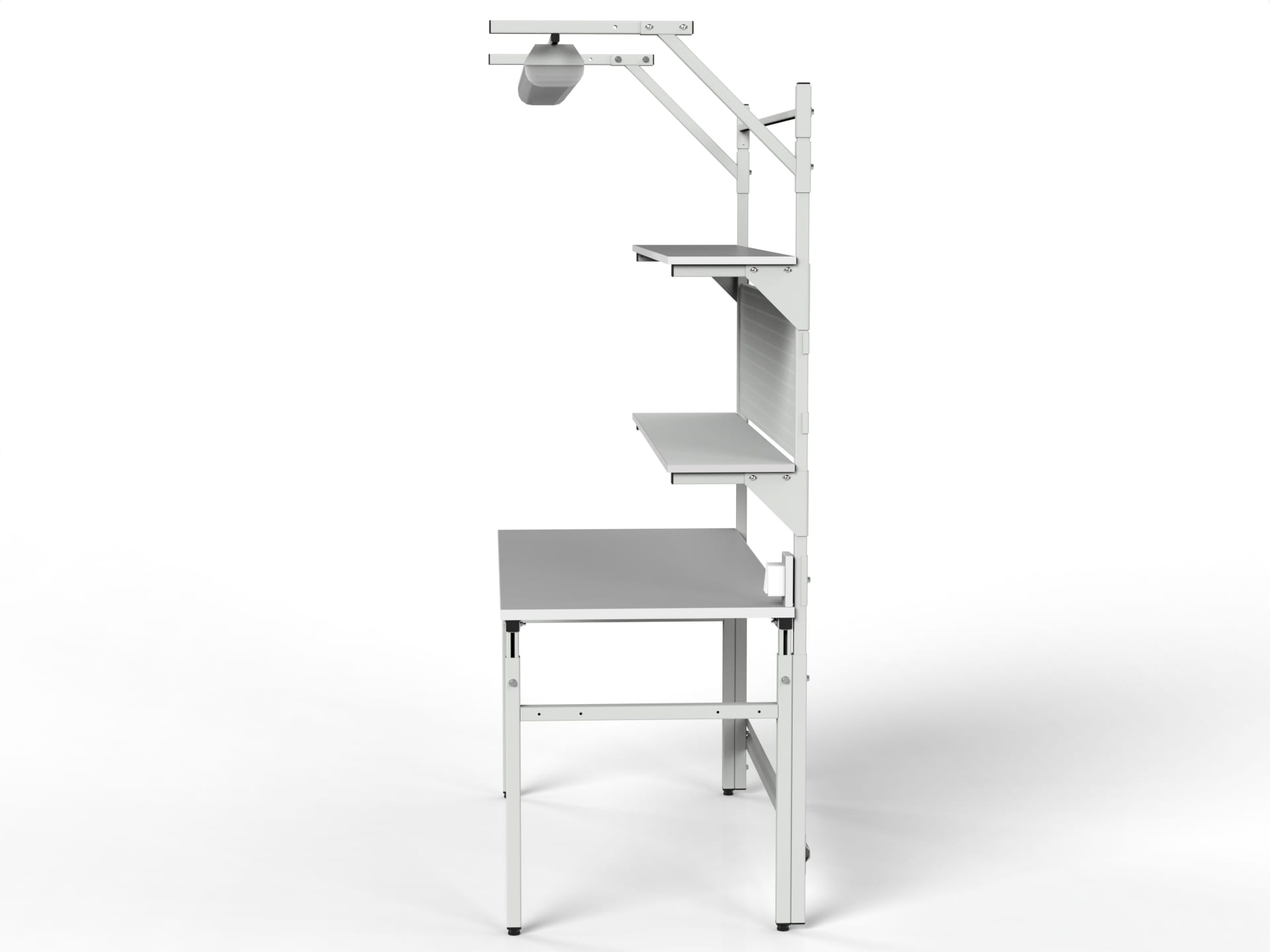 Stół roboczy z regulacją wysokości, dwiema półkami, ścianką i oświetleniem