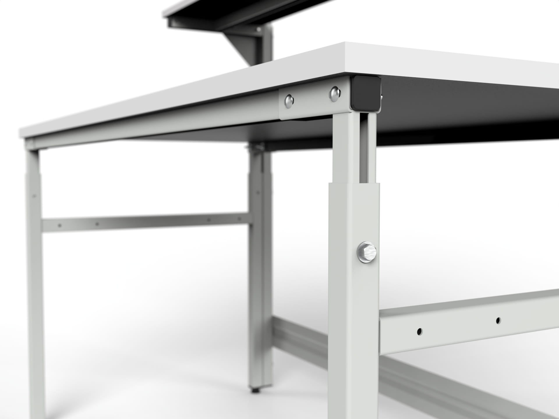 2) Płynna regulacja wysokości blatu stołu roboczego w zakresie 750-1150 mm na czterech śrubach,