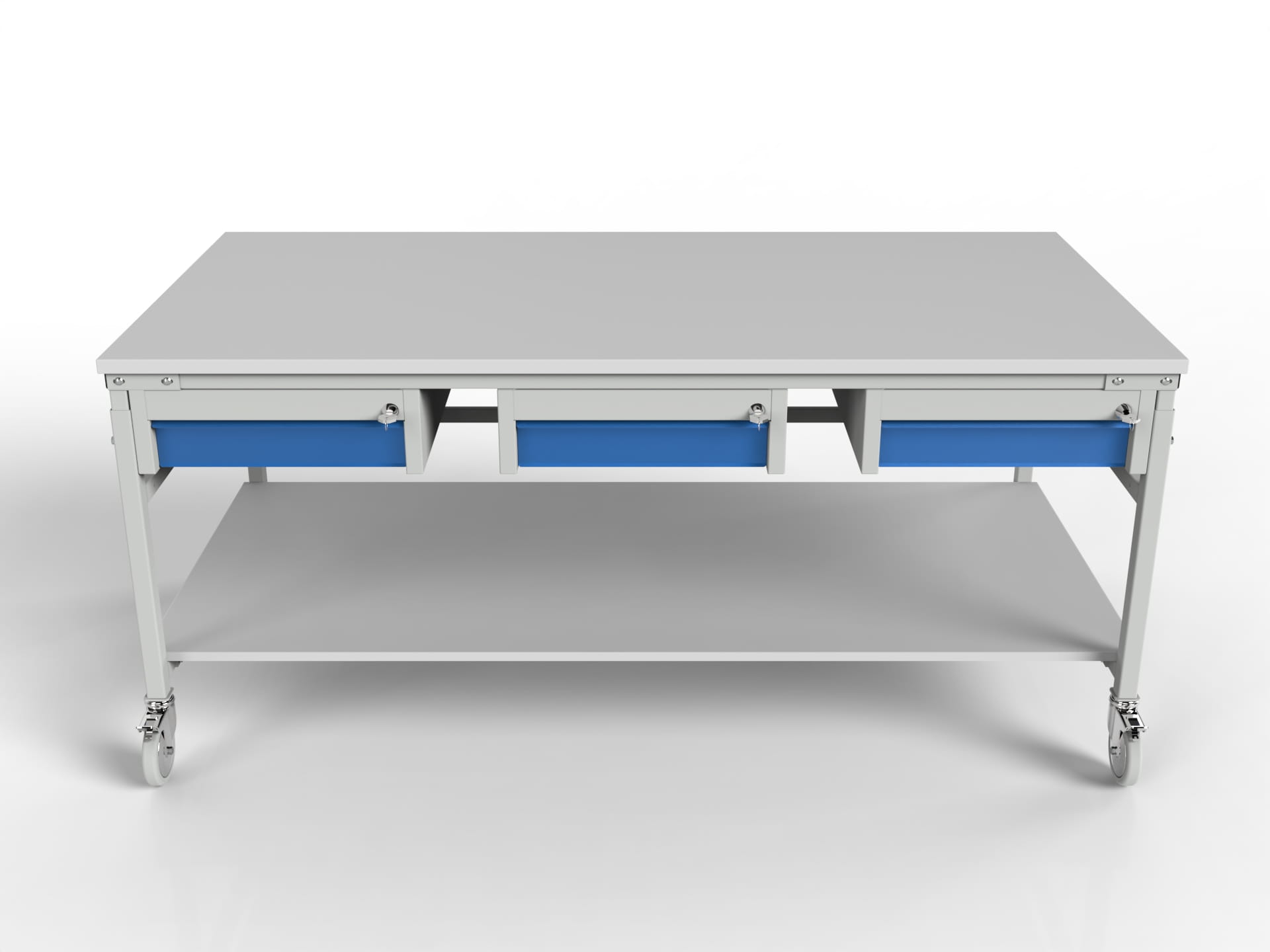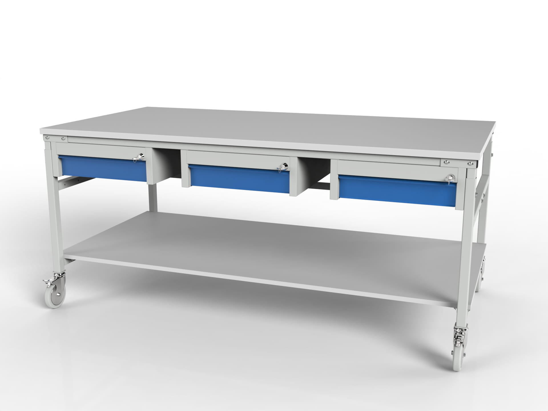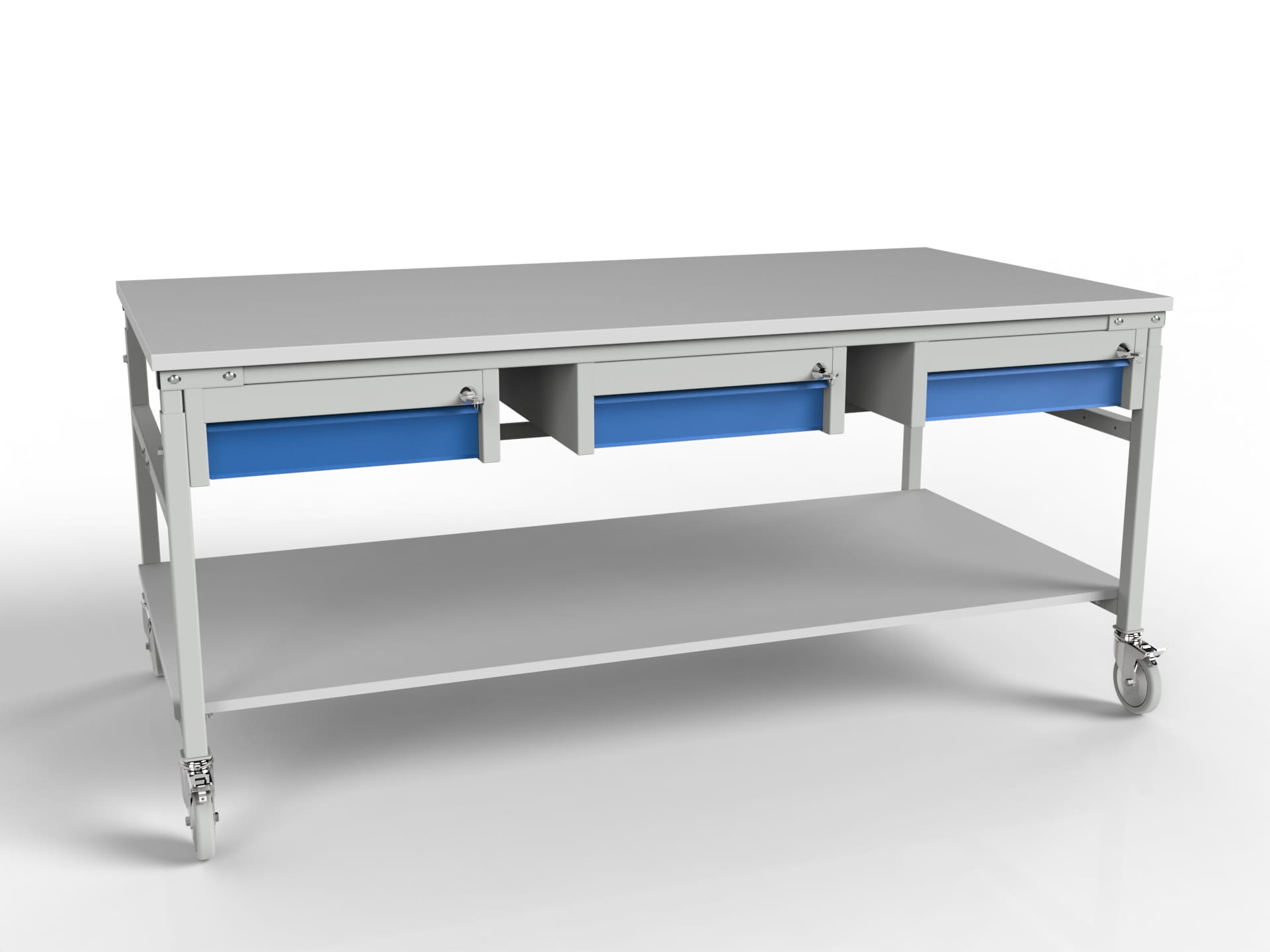 Ergonomiczne stanowisko pracy na kołach, umożliwiające łatwy i sprawny transport części oraz wykonywanie prac tam gdzie jest to w danym momencie potrzebne. Konstrukcja z profili stalowych nadaje stabilność, co w połączeniu z wytrzymałym blatem z płyty melaminowanej zapewnia wysoki udźwig i odporność na uszkodzenia. Trzy podblatowe półki narzędziowe zamykane na klucz umożliwiają bezpieczne przechowywanie narzędzi i części, co w połączeniu z dolną półką znacząco rozszerza przestrzeń roboczą stanowiska. SMMRK6 sprawdzi się wszędzie tam, gdzie wymagane jest połączenie ergonomii z mobilnością - w centrach dystrybucyjnych, magazynach, serwisach czy zakładach produkcyjnych.